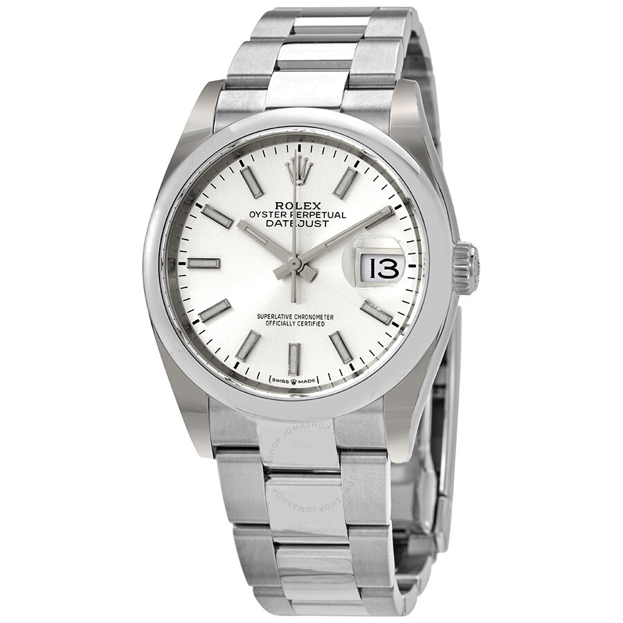 Stainless steel case with a stainless steel Rolex oyster bracelet. Fixed domed stainless steel bezel. Silver dial with luminous silver-tone hands and index hour markers. Minute markers around the outer rim. Dial Type: Analog. Luminescent hands and markers. Date display at the 3 o'clock position. Rolex calibre 3235 automatic movement with a 70-hour power reserve. Scratch resistant sapphire crystal. Screw down crown. Solid case back. Round case shape. Case size: 36 mm. Fold over oyster clasp. Water resistant at 100 meters / 330 feet. Functions: date, hour, minute, second, chronometer. Luxury watch style. Watch label: Swiss Made. Rolex Datejust 36 Automatic Silver Dial Men's Oyster Watch 126200SSO. CASE Case Size: 36 Case Color: Silver-Tone Case Material: Stainless Steel Case Shape: Round Case Back: Solid BAND Band Material: Stainless Steel Rolex Oyster Band Type: Bracelet Band Color: Silver-tone Clasp: Fold Over Oyster DIAL Dial Color: Silver Type: Analog Crystal: Scratch Resistant Sapphire Hands: Luminous Silver-tone Dial Markers: Index Second Markers: Minute Markers around the outer rim Luminiscence: Hands and Markers Bezel: Fixed- Domed Bezel Color: Silver-tone Bezel Material: Stainless Steel Crown: Screw Down INFORMATION Brand: Rolex Series: Datejust Collection Name: Datejust Gender: Mens Model: 126200SSO Watch Label: Swiss Made Movement: Automatic Engine: Rolex Calibre 3235 Power Reserve: 70 hours FEATURES Water Resistance: 100 meters / 330 feet Calendar: Date display at the 3 o'clock position Functions: Date, Hour, Minute, Second, Chronometer Watch Features: Stainless Steel, Chronometer, Analog ADDITIONAL INFO Watch Style: Luxury Warranty: 2 Year Jomashop Warranty Jomashop Sku: RLX126200SSO Department: Watches Category: Watches