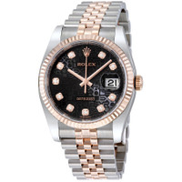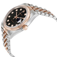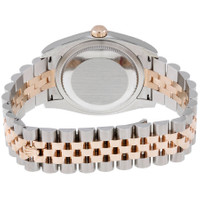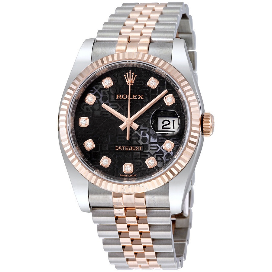 Stainless steel case with a stainless steel Rolex jubilee bracelet with 18kt everose gold center links. Fixed fluted 18kt everose gold bezel. Black jubilee dial with rose gold-tone hands and diamond hour markers. Dial Type: Analog. Date display at the 3 o'clock position. Rolex calibre 3135 automatic movement with a 50-hour power reserve. Scratch resistant sapphire crystal. Screw down crown. Solid case back. Case size: 36 mm. Round case shape. Concealed crown clasp. Water resistant at 100 meters / 330 feet. Functions: date, hour, minute, second. Luxury watch style. Watch label: Swiss Made. Rolex Datejust 36 Black Jubilee Dial Stainless Steel and 18K Everose Gold Rolex Jubilee Automatic Men's Watch 116231BKJDJ. GENERAL Color: Black / Gold / Rose CASE Case Size: 36 Case Color: Silver-Tone Case Material: Stainless Steel Case Shape: Round Case Back: Solid BAND Band Material: Stainless Steel and 18kt Everose Gold Rolex Jubile Band Type: Bracelet Band Color: Two-tone (Silver-tone and Gold-tone) Clasp: Concealed Crown DIAL Dial Color: Black Jubilee Type: Analog Crystal: Scratch Resistant Sapphire Hands: Rose Gold-tone Dial Markers: Diamond Bezel: Fixed Fluted Bezel Material: 18kt Everose Gold Crown: Screw Down INFORMATION Brand: Rolex Series: Datejust Collection Name: Datejust Gender: Mens Model: 116231BKJDJ Watch Label: Swiss Made Movement: Automatic Engine: Rolex Calibre 3135 Power Reserve: 50 hours FEATURES Water Resistance: 100 meters / 330 feet Calendar: Date display at the 3 o'clock position Functions: Date, Hour, Minute, Second, Chronometer Watch Features: Diamond, Stainless Steel, Gold, Chronometer, Analog ADDITIONAL INFO Watch Style: Luxury Warranty: 2 Year Jomashop Warranty UPC Code: 845960074568 Jomashop Sku: RLX116231BKJDJ Department: Watches Category: Watches