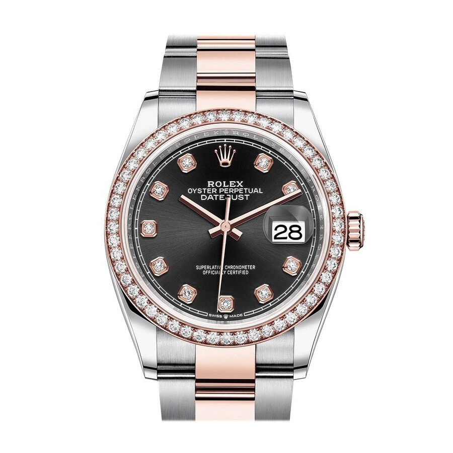 Stainless steel and 18k everose gold case with a stainless steel and 18k everose gold rolex oyster bracelet. Fixed- diamond set bezel. Black dial with everose gold hands and diamond hour markers. Dial Type: Analog. Date display at the 3 o'clock position. Rolex Calibre 3235 automatic movement with a 70-hour power reserve. Scratch resistant sapphire crystal. Screw down crown. Solid case back. Round case shape. Case size: 36 mm. Water resistant at 100 meters / 330 feet. Functions: date, hour, minute, second. Luxury watch style. Watch label: Swiss Made. Rolex Datejust 36 Black Diamond Dial Automatic Men's Steel and 18k Everose Gold Oyster Watch 126281BKDO. CASE Case Size: 36 Case Material: Stainless Steel and 18kt Everose Gold Case Shape: Round Case Back: Solid BAND Band Material: Stainless Steel and 18k Everose Gold Rolex Oyster Band Type: Bracelet Band Color: Two-tone (Silver-tone and Rose Gold-tone) DIAL Dial Color: Black Type: Analog Crystal: Scratch Resistant Sapphire Hands: Everose Gold Dial Markers: Diamond Bezel: Fixed Bezel Color: 18kt Everose Gold Bezel Material: Diamond Set Crown: Screw Down INFORMATION Brand: Rolex Series: Datejust Collection Name: Datejust Gender: Mens Model: 126281BKDO Watch Label: Swiss Made Movement: Automatic Engine: Rolex Calibre 3235 Power Reserve: 70 hours FEATURES Water Resistance: 100 meters / 330 feet Calendar: Date display at the 3 o'clock position Functions: Date, Hour, Minute, Second Watch Features: Diamond, Stainless Steel, Gold, Analog ADDITIONAL INFO Watch Style: Luxury Warranty: 2 Year Jomashop Warranty Jomashop Sku: RLX126281BKDO Department: Watches Category: Watches