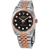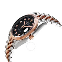 Stainless steel and 18kt everose gold case with a two-tone (silver-tone and gold-tone) stainless steel and 18kt everose gold rolex jubile bracelet. Fixed fluted rose gold-tone 18kt everose gold bezel. Black dial with everose gold hands and diamonds hour markers. Minute markers around the outer rim. Dial Type: Analog. Date display at the 3 o'clock position. Rolex Calibre 3235 automatic movement with a 70-hour power reserve. Scratch resistant sapphire crystal. Screw down crown. Solid case back. Round case shape. Case size: 36 mm. Oyster clasp. Water resistant at 100 meters / 330 feet. Functions: date, hour, minute, second, chronometer. Luxury watch style. Watch label: Swiss Made. Rolex Datejust 36 Black Diamond Dial Automatic Men's Steel and 18kt Everose Gold Jubilee Watch 126231BKDJ. CASE Case Size: 36 Case Material: Stainless Steel and 18kt Everose Gold Case Shape: Round Case Back: Solid BAND Band Material: Stainless Steel and 18kt Everose Gold Rolex Jubile Band Type: Bracelet Band Color: Two-tone (Silver-tone and Gold-tone) Clasp: Oysterclasp DIAL Dial Color: Black Type: Analog Crystal: Scratch Resistant Sapphire Hands: Everose Gold Dial Markers: Diamonds Second Markers: Minute Markers around the outer rim Bezel: Fixed Fluted Bezel Color: Rose Gold-tone Bezel Material: 18kt Everose Gold Crown: Screw Down INFORMATION Brand: Rolex Series: Datejust Collection Name: Datejust Gender: Mens Model: M126231-0019 Watch Label: Swiss Made Movement: Automatic Engine: Rolex Calibre 3235 Power Reserve: 70 hours FEATURES Water Resistance: 100 meters / 330 feet Calendar: Date display at the 3 o'clock position Functions: Date, Hour, Minute, Second, Chronometer Watch Features: Diamond, Stainless Steel, Gold, Chronometer, Analog ADDITIONAL INFO Watch Style: Luxury Warranty: 2 Year Jomashop Warranty Jomashop Sku: RLX126231BKDJ Item Variation: 126231BKDJ, 126231-0019 Department: Watches Category: Watches