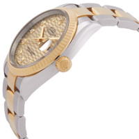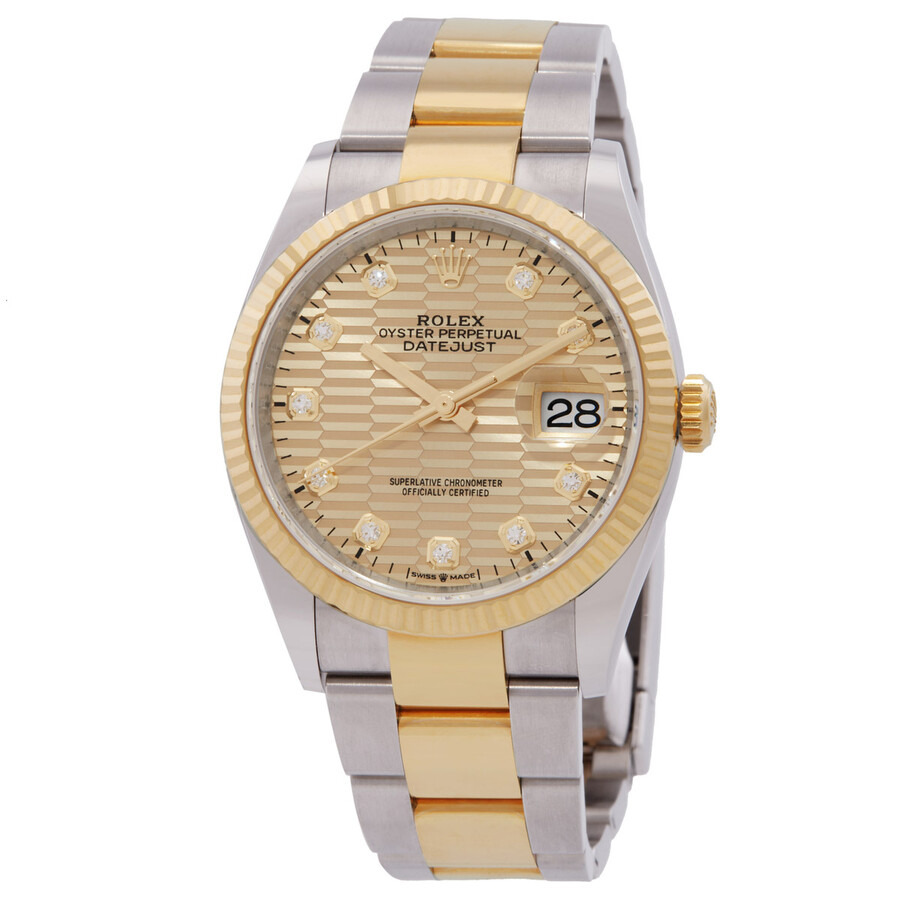 Stainless steel and 18kt yellow gold case with a stainless steel and 18kt yellow gold rolex jubilee bracelet. Fixed, fluted 18kt yellow gold bezel. Diamond hour markers. Dial Type: Analog. Date display at the 3 o'clock position. Rolex Calibre 3235 Automatic movement, based upon Rolex 3035, containing 31 Jewels, bitting at 28800 vph, and has a power reserve of approximately 70 hours. Scratch resistant sapphire crystal. Screw down crown. Solid case back. Round case shape, case size: 36 mm. Folding oyster clasp. Water resistant at 100 meters / 330 feet. Functions: date, hour, minute, second. Datejust 36 Series. Luxury watch style. Watch label: Swiss Made. Rolex Datejust 36 Golden Fluted Diamond Dial Automatic Steel and 18KT Yellow Gold Oyster Watch M126233-0046-0045. GENERAL Box Type: Original Box CASE Case Diameter: 36 mm Case Material: Stainless Steel and 18KT Yellow Gold Case Shape: Round Case Back: Solid BAND Band Material: Stainless Steel and 18KT Yellow Gold Rolex Jubilee Band Type: Bracelet Clasp: Folding Oysterclasp DIAL Dial Color: Golden Fluted Type: Analog Crystal: Scratch Resistant Sapphire Hands: Yellow Gold Dial Markers: Diamond Bezel: Fixed, Fluted Bezel Material: 18KT Yellow Gold Crown: Screw Down INFORMATION Brand: Rolex Series: Datejust Collection Name: Datejust Gender: Mens Model: M126233-0046 Watch Label: Swiss Made Movement: Automatic Engine: Rolex Calibre 3235 Power Reserve: 70 hours FEATURES Water Resistance: 100 meters / 330 feet Calendar: Date display at the 3 o'clock position Functions: Date, Hour, Minute, Second Watch Features: Analog, Gold, Stainless Steel, Diamond ADDITIONAL INFO Watch Style: Luxury Warranty: 2 Year Jomashop Warranty Jomashop Sku: RLX126233-0046 Item Variation: 126233-0046 Department: Watches Category: Watches