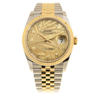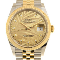 Stainless steel and 18kt yellow gold case with a stainless steel and 18kt yellow gold jubilee bracelet. Fixed, fluted 18kt yellow gold bezel. Golden palm-motif dial with yellow gold hands and diamond hour markers. Dial Type: Analog. Date display at the 3 o'clock position. Rolex Calibre 3235 Automatic movement, based upon Rolex 3035, containing 31 Jewels, bitting at 28800 vph, and has a power reserve of approximately 70 hours. Scratch resistant sapphire crystal. Screw down crown. Solid case back. Round case shape, case size: 36 mm. Folding oyster clasp. Water resistant at 100 meters / 330 feet. Functions: date, hour, minute, second. Datejust 36 Series. Luxury watch style. Watch label: Swiss Made. Rolex Datejust 36 Golden Palm-Motif Diamond Dial Automatic Men's Steel and 18KT Yellow Gold Jubilee Watch M126233-0043. INFORMATION Brand: Rolex Series: Datejust Collection Name: Datejust Gender: Mens Model: M126233-0043 Watch Label: Swiss Made Movement: Automatic Engine: Rolex Calibre 3235 Power Reserve: 70 hours CASE Case Size: 36 mm Case Material: Stainless Steel and 18KT Yellow Gold Case Shape: Round Case Back: Solid BAND Band Material: Stainless Steel and 18KT Yellow Gold Jubilee Band Type: Bracelet Clasp: Folding Oysterclasp DIAL Dial Color: Golden Palm-Motif Type: Analog Crystal: Scratch Resistant Sapphire Hands: Yellow Gold Dial Markers: Diamond Bezel: Fixed, Fluted Bezel Material: 18KT Yellow Gold Crown: Screw Down FEATURES Water Resistance: 100 meters / 330 feet Calendar: Date display at the 3 o'clock position Functions: Date, Hour, Minute, Second Watch Features: Diamond, Stainless Steel, Gold, Analog ADDITIONAL INFO Watch Style: Luxury Warranty: 2 Year Jomashop Warranty Jomashop Sku: RLX126233-0043 Item Variation: 126233-0043 Department: Watches Category: Watches