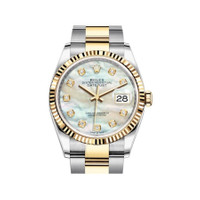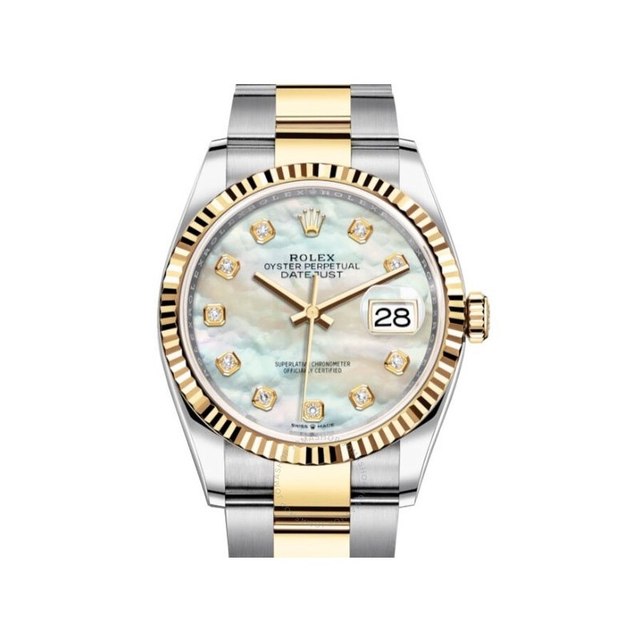 Stainless steel and 18kt yellow gold case with a stainless steel and 18kt yellow gold rolex oyster bracelet. Fixed, fluted bezel. Mother of pearl dial with yellow gold hands and diamonds hour markers. Dial Type: Analog. Date display at the 3 o'clock position. Rolex Calibre 3235 automatic movement with a 70-hour power reserve. Scratch resistant sapphire crystal. Screw down crown. Solid case back. Round case shape. Case size: 36 mm. Water resistant at 100 meters / 330 feet. Functions: date, hour, minute, second. Luxury watch style. Watch label: Swiss Made. Rolex Datejust 36 Mother of Pearl Diamond Dial Men's Stainless Steel and 18kt Yellow Gold Oyster Watch 126233MDO. CASE Case Size: 36 Case Material: Stainless Steel and 18kt Yellow Gold Case Shape: Round Case Back: Solid BAND Band Material: Stainless Steel and 18kt Yellow Gold Rolex Oyster Band Type: Bracelet Band Color: Two-tone (Silver-tone and Gold-tone) DIAL Dial Color: Mother of Pearl Type: Analog Crystal: Scratch Resistant Sapphire Hands: Yellow Gold Dial Markers: Diamonds Bezel: Fixed Fluted Bezel Material: 18kt Yellow Gold Crown: Screw Down INFORMATION Brand: Rolex Series: Datejust Collection Name: Datejust Gender: Mens Model: M126233-0024 Watch Label: Swiss Made Movement: Automatic Engine: Rolex Calibre 3235 Power Reserve: 70 hours FEATURES Water Resistance: 100 meters / 330 feet Calendar: Date display at the 3 o'clock position Functions: Date, Hour, Minute, Second Watch Features: Diamond, Stainless Steel, Gold, Analog ADDITIONAL INFO Watch Style: Luxury Warranty: 2 Year Jomashop Warranty Jomashop Sku: RLX126233MDO Item Variation: 126233MDO,126233-0024 Department: Watches Category: Watches