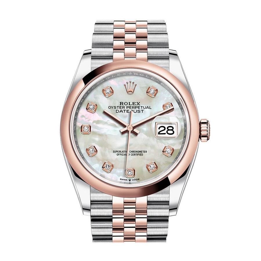 Stainless steel and 18k everose gold case with a stainless steel and 18k everose gold rolex jubilee bracelet. Fixed, domed bezel. Mother of pearl dial with everose gold hands and diamonds hour markers. Dial Type: Analog. Date display at the 3 o'clock position. Rolex Calibre 3235 automatic movement with a 70-hour power reserve. Scratch resistant sapphire crystal. Screw down crown. Solid case back. Round case shape. Case size: 36 mm. Water resistant at 100 meters / 330 feet. Functions: date, hour, minute, second. Luxury watch style. Watch label: Swiss Made. Rolex Datejust 36 Mother of Pearl Diamond Dial Men's Steel and 18k Everose Gold Jubilee Watch 126201MDJ. CASE Case Size: 36 Case Material: Stainless Steel and 18kt Everose Gold Case Shape: Round Case Back: Solid BAND Band Material: Stainless Steel and 18k Everose Gold Rolex Jubilee Band Type: Bracelet Band Color: Two-tone (Silver-tone and Rose Gold-tone) DIAL Dial Color: Mother of Pearl Type: Analog Crystal: Scratch Resistant Sapphire Hands: Everose Gold Dial Markers: Diamonds Bezel: Fixed Domed Bezel Material: 18kt Everose Gold Crown: Screw Down INFORMATION Brand: Rolex Series: Datejust Collection Name: Datejust Gender: Mens Model: 126201MDJ Watch Label: Swiss Made Movement: Automatic Engine: Rolex Calibre 3235 Power Reserve: 70 hours FEATURES Water Resistance: 100 meters / 330 feet Calendar: Date display at the 3 o'clock position Functions: Date, Hour, Minute, Second Watch Features: Diamond, Stainless Steel, Gold, Analog ADDITIONAL INFO Watch Style: Luxury Warranty: 2 Year Jomashop Warranty Jomashop Sku: RLX126201MDJ Department: Watches Category: Watches