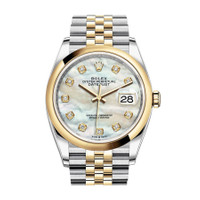 Stainless steel and 18k yellow gold case with a stainless steel and 18k yellow gold rolex jubilee bracelet. Fixed-domed bezel. Mother of pearl dial with yellow gold hands and diamonds hour markers. Dial Type: Analog. Date display at the 3 o'clock position. Rolex Calibre 3235 automatic movement with a 70-hour power reserve. Scratch resistant sapphire crystal. Screw down crown. Solid case back. Round case shape. Case size: 36 mm. Water resistant at 100 meters / 330 feet. Functions: date, hour, minute, second. Luxury watch style. Watch label: Swiss Made. Rolex Datejust 36 Mother of Pearl Diamond Dial Men's Steel and 18k Yellow Gold Jubilee Watch 126203MDJ. CASE Case Size: 36 Case Material: Stainless Steel and 18kt Yellow Gold Case Shape: Round Case Back: Solid BAND Band Material: Stainless Steel and 18k Yellow Gold Rolex Jubilee Band Type: Bracelet Band Color: Two-tone (Silver-tone and Gold-tone) DIAL Dial Color: Mother of Pearl Type: Analog Crystal: Scratch Resistant Sapphire Hands: Yellow Gold Dial Markers: Diamonds Bezel: Fixed Domed Bezel Material: 18kt Yellow Gold Crown: Screw Down INFORMATION Brand: Rolex Series: Datejust Collection Name: Datejust Gender: Mens Model: M126203-0023 Watch Label: Swiss Made Movement: Automatic Engine: Rolex Calibre 3235 Power Reserve: 70 hours FEATURES Water Resistance: 100 meters / 330 feet Calendar: Date display at the 3 o'clock position Functions: Date, Hour, Minute, Second Watch Features: Diamond, Stainless Steel, Gold, Analog ADDITIONAL INFO Watch Style: Luxury Warranty: 2 Year Jomashop Warranty Jomashop Sku: RLX126203MDJ Item Variation: 126203MDJ,126203-0023 Department: Watches Category: Watches