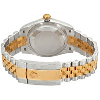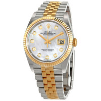 Stainless steel case with a stainless steel Rolex jubilee bracelet with 18kt yellow gold center links. Fixed fluted 18kt everose gold bezel. Mother of pearl dial with yellow gold hands and diamond hour markers. Minute markers around the outer rim. Dial Type: Analog. Date display at the 3 o'clock position. Rolex calibre 3235 Automatic movement, based upon Rolex 3035, containing 31 Jewels, bitting at 28800 vph, and has a power reserve of approximately 70 hours. Scratch resistant sapphire crystal. Screw down crown. Solid case back. Round case shape. Case size: 36 mm. Oyster clasp. Water resistant at 100 meters / 330 feet. Functions: date, hour, minute, second, chronometer. Datejust 36 Series. Luxury watch style. Watch label: Swiss Made. Item Variations: 126233-0023, 126233. Rolex Datejust 36 Mother of Pearl Diamond Dial Men's Watch 126233MDJ. CASE Case Size: 36 Case Material: Stainless Steel Case Shape: Round Case Back: Solid BAND Band Material: Stainless Steel and 18kt Yellow Gold Rolex Jubilee Band Type: Bracelet Clasp: Oyster DIAL Dial Color: Mother of Pearl Type: Analog Crystal: Scratch Resistant Sapphire Hands: Yellow Gold Dial Markers: Diamond Second Markers: Minute Markers around the outer rim Bezel: Fixed Fluted Bezel Material: 18kt Everose Gold Crown: Screw Down INFORMATION Brand: Rolex Series: Datejust Collection Name: Datejust Gender: Mens Model: M126233-0023 Watch Label: Swiss Made Movement: Automatic Engine: Rolex Calibre 3235 Power Reserve: 70 hours FEATURES Water Resistance: 100 meters / 330 feet Calendar: Date display at the 3 o'clock position Functions: Date, Hour, Minute, Second, Chronometer Watch Features: Diamond, Stainless Steel, Gold, Chronometer, Analog ADDITIONAL INFO Watch Style: Luxury Warranty: 2 Year Jomashop Warranty Jomashop Sku: RLX126233MDJ Item Variation: 126233-0023, 126233MDJ Department: Watches Category: Watches