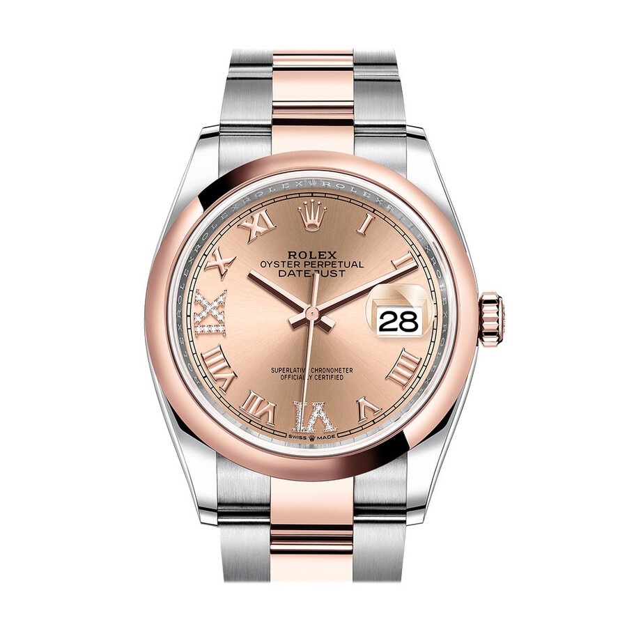 Stainless steel and 18k everose gold case with a stainless steel and 18k everose gold rolex oyster bracelet. Fixed bezel. Pink dial with everose gold hands and Roman numeral hour markers. Dial Type: Analog. Date display at the 3 o'clock position. Rolex Calibre 3235 automatic movement with a 70-hour power reserve. Scratch resistant sapphire crystal. Screw down crown. Solid case back. Round case shape. Case size: 36 mm. Water resistant at 100 meters / 330 feet. Functions: date, hour, minute, second. Luxury watch style. Watch label: Swiss Made. Rolex Datejust 36 Pink Diamond Dial Men's Steel and 18K Everose Gold Oyster Watch 126201PKRDO. CASE Case Size: 36 Case Material: Stainless Steel and 18kt Everose Gold Case Shape: Round Case Back: Solid BAND Band Material: Stainless Steel and 18K Everose Gold Rolex Oyster Band Type: Bracelet Band Color: Two-tone (Silver-tone and Rose Gold-tone) DIAL Dial Color: Pink Type: Analog Crystal: Scratch Resistant Sapphire Hands: Everose Gold Dial Markers: Roman Numeral Bezel: Fixed Bezel Material: 18kt Everose Gold Crown: Screw Down INFORMATION Brand: Rolex Series: Datejust Collection Name: Datejust Gender: Mens Model: 126201PKRDO Watch Label: Swiss Made Movement: Automatic Engine: Rolex Calibre 3235 Power Reserve: 70 hours FEATURES Water Resistance: 100 meters / 330 feet Calendar: Date display at the 3 o'clock position Functions: Date, Hour, Minute, Second Watch Features: Diamond, Stainless Steel, Gold, Analog ADDITIONAL INFO Watch Style: Luxury Warranty: 2 Year Jomashop Warranty Jomashop Sku: RLX126201PKRDO Department: Watches Category: Watches