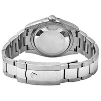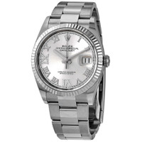 Stainless steel and 18k white gold case with a stainless steel rolex oyster bracelet. Fixed fluted stainless steel and 18kt white gold fluted bezel bezel. Silver dial with silver-tone hands and Roman- diamonds numeral hour markers. Dial Type: Analog. Date display at the 3 o'clock position. Rolex Calibre 3235 automatic movement with a 70-hour power reserve. Scratch resistant sapphire crystal. Screw down crown. Solid case back. Round case shape. Case size: 36 mm. Oysterlock clasp. Water resistant at 100 meters / 330 feet. Functions: date, hour, minute, second. Luxury watch style. Watch label: Swiss Made. Rolex Datejust 36 Silver Diamond Dial Automatic Ladies Oyster Watch 126234SRDO. INFORMATION Brand: Rolex Series: Datejust Collection Name: Datejust Gender: Womens Model: M126234-0030 Watch Label: Swiss Made Movement: Automatic Engine: Rolex Calibre 3235 Power Reserve: 70 hours CASE Case Size: 36 mm Case Material: Stainless Steel and 18k White Gold Case Shape: Round Case Back: Solid BAND Band Material: Stainless Steel Rolex Oyster Band Type: Bracelet Clasp: Oysterlock DIAL Dial Color: Silver Type: Analog Crystal: Scratch Resistant Sapphire Hands: Silver-tone Dial Markers: Roman- Diamonds Numeral Bezel: Fixed Fluted Bezel Material: Stainless Steel and 18kt White Gold Fluted Bezel Crown: Screw Down FEATURES Water Resistance: 100 meters / 330 feet Calendar: Date display at the 3 o'clock position Functions: Date, Hour, Minute, Second Watch Features: Diamond, Stainless Steel, Gold, Analog ADDITIONAL INFO Watch Style: Luxury Warranty: 2 Year Jomashop Warranty UPC Code: 842047177907 Jomashop Sku: RLX126234SRDO Item Variation: 126234SRDO,126234-0030 Department: Watches Category: Watches