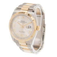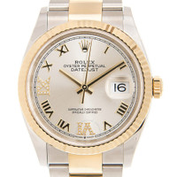 Stainless steel and 18kt yellow gold case with a two-tone (silver-tone and gold-tone) stainless steel and 18kt yellow gold rolex oyster bracelet. Fixed 18kt yellow gold bezel. Silver dial with yellow gold hands and Roman numeral hour markers. Minute markers around the outer rim. Dial Type: Analog. Date display at the 3 o'clock position. Rolex Calibre 3235 Automatic movement, based upon Rolex 3035, containing 31 Jewels, bitting at 28800 vph, and has a power reserve of approximately 70 hours. Scratch resistant sapphire crystal. Screw down crown. Solid case back. Round case shape. Case size: 36 mm. Oyster clasp. Water resistant at 100 meters / 330 feet. Functions: date, hour, minute, second. Luxury watch style. Watch label: Swiss Made. Rolex Datejust 36 Silver Diamond Dial Men's Stainless Steel and 18kt Yellow Gold Oyster Watch 126233SRDO. CASE Case Size: 36 Case Material: Stainless Steel and 18kt Yellow Gold Case Shape: Round Case Back: Solid BAND Band Material: Stainless Steel and 18kt Yellow Gold Rolex Oyster Band Type: Bracelet Band Color: Two-tone (Silver-tone and Gold-tone) Clasp: Oysterclasp DIAL Dial Color: Silver Type: Analog Crystal: Scratch Resistant Sapphire Hands: Yellow Gold Dial Markers: Roman Numeral Second Markers: Minute Markers around the outer rim Bezel: Fixed Bezel Material: 18kt Yellow Gold Crown: Screw Down INFORMATION Brand: Rolex Series: Datejust Collection Name: Datejust Gender: Mens Model: M126233-0032 Watch Label: Swiss Made Movement: Automatic Engine: Rolex Calibre 3235 Power Reserve: 70 hours FEATURES Water Resistance: 100 meters / 330 feet Calendar: Date display at the 3 o'clock position Functions: Date, Hour, Minute, Second Watch Features: Diamond, Stainless Steel, Gold, Analog ADDITIONAL INFO Watch Style: Luxury Warranty: 2 Year Jomashop Warranty Jomashop Sku: RLX126233SRDO Item Variation: 126233SRDO,126233-0032 Department: Watches Category: Watches
