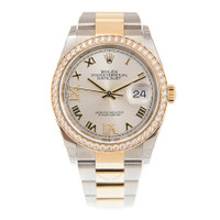 Stainless steel and 18kt yellow gold case with a stainless steel and 18kt yellow gold rolex oyster bracelet. Fixed bezel. Silver dial with yellow gold hands and Roman numeral hour markers. Dial Type: Analog. Date display at the 3 o'clock position. Rolex Calibre 3235 automatic movement with a 70-hour power reserve. Scratch resistant sapphire crystal. Screw down crown. Solid case back. Round case shape. Case size: 36 mm. Water resistant at 100 meters / 330 feet. Functions: date, hour, minute, second. Luxury watch style. Watch label: Swiss Made. Rolex Datejust 36 Silver Diamond Dial Men's Steel and 18kt Yellow Gold Oyster Watch 126283SRDO. CASE Case Size: 36 Case Material: Stainless Steel and 18kt Yellow Gold Case Shape: Round Case Back: Solid BAND Band Material: Stainless Steel and 18kt Yellow Gold Rolex Oyster Band Type: Bracelet Band Color: Two-tone (Silver-tone and Gold-tone) DIAL Dial Color: Silver Type: Analog Crystal: Scratch Resistant Sapphire Hands: Yellow Gold Dial Markers: Roman Numeral Bezel: Fixed Bezel Material: Diamond Set Crown: Screw Down INFORMATION Brand: Rolex Series: Datejust Collection Name: Datejust Gender: Mens Model: 126283SRDO Watch Label: Swiss Made Movement: Automatic Engine: Rolex Calibre 3235 Power Reserve: 70 hours FEATURES Water Resistance: 100 meters / 330 feet Calendar: Date display at the 3 o'clock position Functions: Date, Hour, Minute, Second Watch Features: Diamond, Stainless Steel, Gold, Analog ADDITIONAL INFO Watch Style: Luxury Warranty: 2 Year Jomashop Warranty Jomashop Sku: RLX126283SRDO Department: Watches Category: Watches