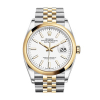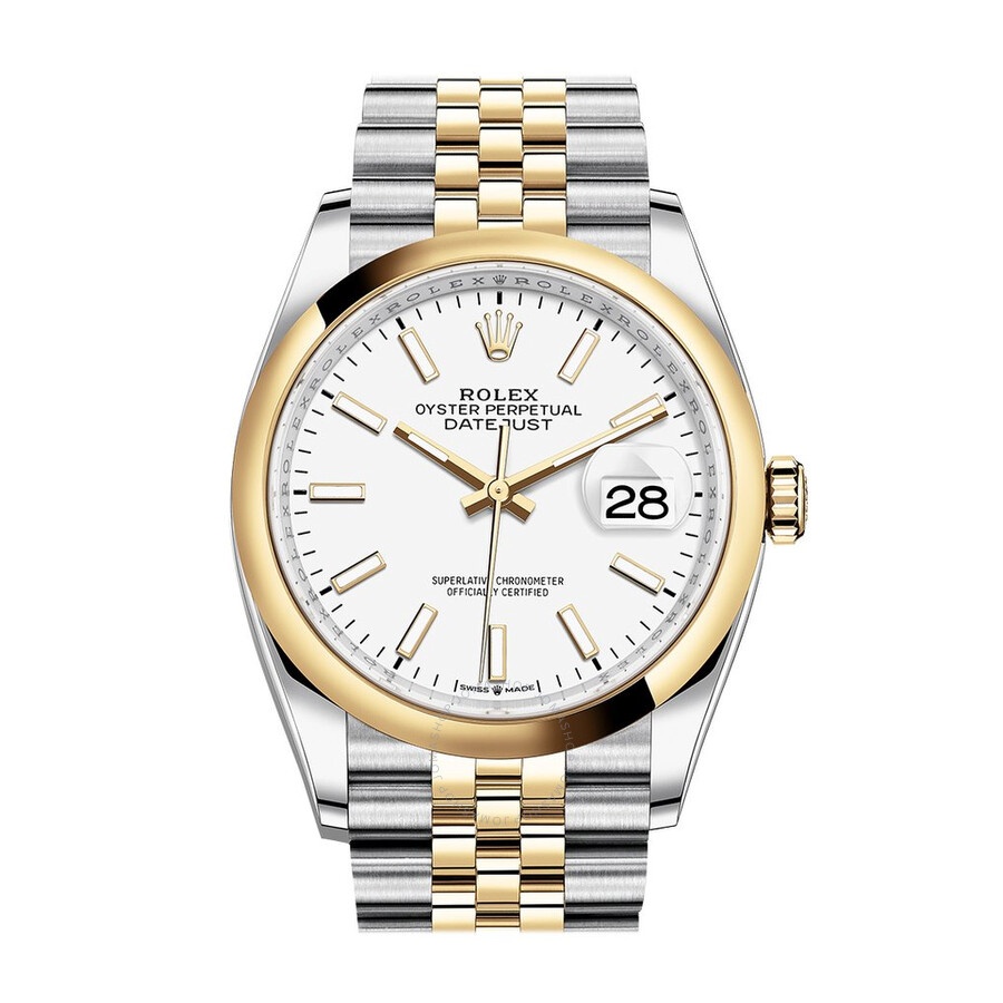 Stainless steel and 18k yellow gold case with a stainless steel and 18k yellow gold rolex jubilee bracelet. Fixed bezel. White dial with yellow gold hands and index hour markers. Dial Type: Analog. Date display at the 3 o'clock position. Rolex Calibre 3235 automatic movement with a 70-hour power reserve. Scratch resistant sapphire crystal. Screw down crown. Solid case back. Round case shape. Case size: 36 mm. Water resistant at 100 meters / 330 feet. Functions: date, hour, minute, second. Luxury watch style. Watch label: Swiss Made. Rolex Datejust 36 White Dial Automatic Men's Steel and 18k Yellow Gold Jubilee Watch 126203WSJ. CASE Case Size: 36 Case Material: Stainless Steel and 18kt Yellow Gold Case Shape: Round Case Back: Solid BAND Band Material: Stainless Steel and 18k Yellow Gold Rolex Jubilee Band Type: Bracelet Band Color: Two-tone (Silver-tone and Gold-tone) DIAL Dial Color: White Type: Analog Crystal: Scratch Resistant Sapphire Hands: Yellow Gold Dial Markers: Index Bezel: Fixed Bezel Material: 18kt Yellow Gold Crown: Screw Down INFORMATION Brand: Rolex Series: Datejust Collection Name: Datejust Gender: Mens Model: M126203-0019 Watch Label: Swiss Made Movement: Automatic Engine: Rolex Calibre 3235 Power Reserve: 70 hours FEATURES Water Resistance: 100 meters / 330 feet Calendar: Date display at the 3 o'clock position Functions: Date, Hour, Minute, Second Watch Features: Stainless Steel, Gold, Analog ADDITIONAL INFO Watch Style: Luxury Warranty: 2 Year Jomashop Warranty Jomashop Sku: RLX126203WSJ Item Variation: 126203WSJ,126203-0019 Department: Watches Category: Watches