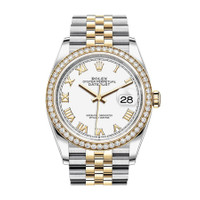Stainless steel and 18kt yellow gold case with a stainless steel and 18kt yellow gold rolex jubilee bracelet. Fixed-diamond set bezel. White dial with yellow gold hands and Roman numeral hour markers. Dial Type: Analog. Date display at the 3 o'clock position. Rolex Calibre 3235 automatic movement with a 70-hour power reserve. Scratch resistant sapphire crystal. Screw down crown. Solid case back. Round case shape. Case size: 36 mm. Water resistant at 100 meters / 330 feet. Functions: date, hour, minute, second. Luxury watch style. Watch label: Swiss Made. Rolex Datejust 36 White Dial Men's Steel and 18kt Yellow Gold Jubilee Watch 126283WRJ. CASE Case Size: 36 Case Material: Stainless Steel and 18kt Yellow Gold Case Shape: Round Case Back: Solid BAND Band Material: Stainless Steel and 18kt Yellow Gold Rolex Jubilee Band Type: Bracelet Band Color: Two-tone (Silver-tone and Gold-tone) DIAL Dial Color: White Type: Analog Crystal: Scratch Resistant Sapphire Hands: Yellow Gold Dial Markers: Roman Numeral Bezel: Fixed Bezel Color: 18kt Yellow Gold Bezel Material: Diamond Set Crown: Screw Down INFORMATION Brand: Rolex Series: Datejust Collection Name: Datejust Gender: Mens Model: 126283WRJ Watch Label: Swiss Made Movement: Automatic Engine: Rolex Calibre 3235 Power Reserve: 70 hours FEATURES Water Resistance: 100 meters / 330 feet Calendar: Date display at the 3 o'clock position Functions: Date, Hour, Minute, Second Watch Features: Diamond, Stainless Steel, Gold, Analog ADDITIONAL INFO Watch Style: Luxury Warranty: 2 Year Jomashop Warranty Jomashop Sku: RLX126283WRJ Department: Watches Category: Watches