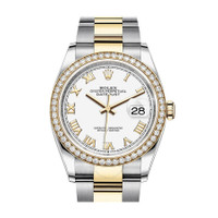 Stainless steel and 18kt yellow gold case with a stainless steel and 18kt yellow gold rolex oyster bracelet. Fixed-diamond set bezel. White dial with yellow gold hands and Roman numeral hour markers. Dial Type: Analog. Date display at the 3 o'clock position. Rolex Calibre 3235 automatic movement with a 70-hour power reserve. Scratch resistant sapphire crystal. Screw down crown. Solid case back. Round case shape. Case size: 36 mm. Water resistant at 100 meters / 330 feet. Functions: date, hour, minute, second. Luxury watch style. Watch label: Swiss Made. Rolex Datejust 36 White Dial Men's Steel and 18kt Yellow Gold Oyster Watch 126283WRO. CASE Case Size: 36 Case Material: Stainless Steel and 18kt Yellow Gold Case Shape: Round Case Back: Solid BAND Band Material: Stainless Steel and 18kt Yellow Gold Rolex Oyster Band Type: Bracelet Band Color: Two-tone (Silver-tone and Gold-tone) DIAL Dial Color: White Type: Analog Crystal: Scratch Resistant Sapphire Hands: Yellow Gold Dial Markers: Roman Numeral Bezel: Fixed Bezel Color: 18kt Yellow Gold Bezel Material: Diamond Set Crown: Screw Down INFORMATION Brand: Rolex Series: Datejust Collection Name: Datejust Gender: Mens Model: 126283WRO Watch Label: Swiss Made Movement: Automatic Engine: Rolex Calibre 3235 Power Reserve: 70 hours FEATURES Water Resistance: 100 meters / 330 feet Calendar: Date display at the 3 o'clock position Functions: Date, Hour, Minute, Second Watch Features: Diamond, Stainless Steel, Gold, Analog ADDITIONAL INFO Watch Style: Luxury Warranty: 2 Year Jomashop Warranty Jomashop Sku: RLX126283WRO Department: Watches Category: Watches