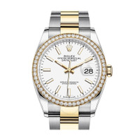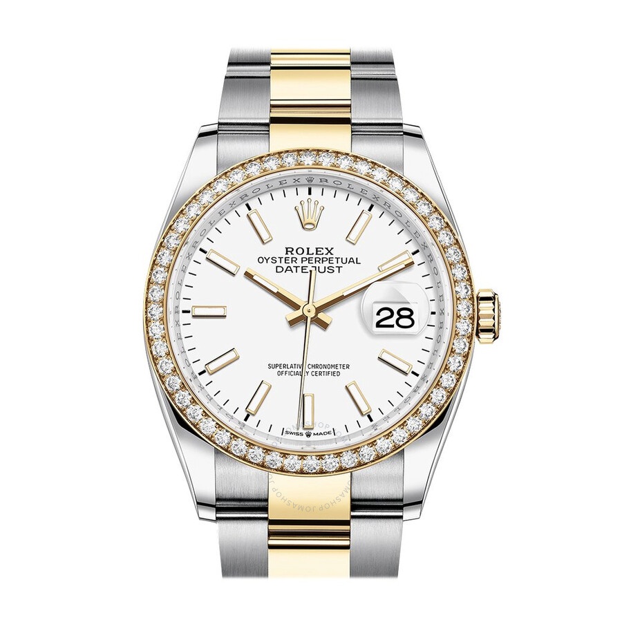 Stainless steel and 18kt yellow gold case with a stainless steel and 18kt yellow gold rolex oyster bracelet. Fixed-diamond set bezel. White dial with yellow gold hands and index hour markers. Dial Type: Analog. Date display at the 3 o'clock position. Rolex Calibre 3235 automatic movement with a 70-hour power reserve. Scratch resistant sapphire crystal. Screw down crown. Solid case back. Round case shape. Case size: 36 mm. Water resistant at 100 meters / 330 feet. Functions: date, hour, minute, second. Luxury watch style. Watch label: Swiss Made. Rolex Datejust 36 White Dial Men's Steel and 18kt Yellow Gold Oyster Watch 126283WSO. CASE Case Size: 36 Case Material: Stainless Steel and 18kt Yellow Gold Case Shape: Round Case Back: Solid BAND Band Material: Stainless Steel and 18kt Yellow Gold Rolex Oyster Band Type: Bracelet Band Color: Two-tone (Silver-tone and Gold-tone) DIAL Dial Color: White Type: Analog Crystal: Scratch Resistant Sapphire Hands: Yellow Gold Dial Markers: Index Bezel: Fixed Bezel Color: 18kt Yellow Gold Bezel Material: Diamond Set Crown: Screw Down INFORMATION Brand: Rolex Series: Datejust Collection Name: Datejust Gender: Mens Model: 126283WSO Watch Label: Swiss Made Movement: Automatic Engine: Rolex Calibre 3235 Power Reserve: 70 hours FEATURES Water Resistance: 100 meters / 330 feet Calendar: Date display at the 3 o'clock position Functions: Date, Hour, Minute, Second Watch Features: Diamond, Stainless Steel, Gold, Analog ADDITIONAL INFO Watch Style: Luxury Warranty: 2 Year Jomashop Warranty Jomashop Sku: RLX126283WSO Department: Watches Category: Watches