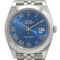 Stainless steel case with a stainless steel jubilee bracelet. Fixed smooth stainless steel bezel. Blue dial with luminous silver-tone hands and Roman numeral hour markers. Minute markers around the outer rim. Dial Type: Analog. Luminescent hands. Date display at the 3 o'clock position. Rolex calibre 3235 automatic movement, based upon Rolex 3035, containing 31 Jewels, bitting at 28800 vph, and has a power reserve of approximately 70 hours. Scratch resistant sapphire crystal. Screw down crown. Solid case back. Round case shape. Case size: 41 mm. Oysterlock clasp. Water resistant at 100 meters / 330 feet. Functions: date, hour, minute, second. Datejust 41 Series. Luxury watch style. Watch label: Swiss Made. Rolex Datejust 41 Automatic Blue Dial Men's Jubilee Watch 126300BLRJ. INFORMATION Brand: Rolex Series: Datejust Collection Name: Datejust Gender: Mens Model: 126300BLRJ Watch Label: Swiss Made Movement: Automatic Engine: Rolex Calibre 3235 Power Reserve: 70 hours CASE Case Size: 41 mm Case Material: Stainless Steel Case Shape: Round Case Back: Solid BAND Band Material: Stainless Steel Jubilee Band Type: Bracelet Band Color: Silver-tone Clasp: Oysterlock DIAL Dial Color: Blue Type: Analog Crystal: Scratch Resistant Sapphire Hands: Luminous Silver-tone Dial Markers: Roman Numeral Second Markers: Minute Markers around the outer rim Luminiscence: Hands Bezel: Fixed Smooth Bezel Material: Stainless Steel Crown: Screw Down FEATURES Water Resistance: 100 meters / 330 feet Calendar: Date display at the 3 o'clock position Functions: Date, Hour, Minute, Second Watch Features: Stainless Steel, Analog ADDITIONAL INFO Watch Style: Luxury Warranty: 2 Year Jomashop Warranty Jomashop Sku: RLX126300BLRJ Item Variation: m126300-0018 Department: Watches Category: Watches