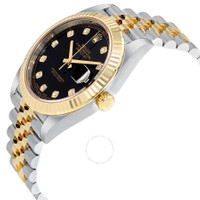 Stainless steel case with a stainless steel Rolex jubilee bracelet with 18kt yellow gold center links. Fixed fluted 18kt yellow gold bezel. Black dial with yellow gold-tone hands and diamond / Roman numeral hour markers. Minute markers around the outer rim. Dial Type: Analog. Date display at the 3 o'clock position. Rolex calibre 3235 automatic movement with a 70-hour power reserve. Scratch resistant sapphire crystal. Screw down crown. Solid case back. Case size: 41 mm. Round case shape. Oysterlock clasp. Water resistant at 100 meters / 330 feet. Functions: date, hour, minute, second. Luxury watch style. Watch label: Swiss Made. Rolex Datejust 41 Black Diamond Dial Stee and 18K Yellow Gold Jubilee Men's Watch 12633BKDJ. CASE Case Size: 41 Case Color: Silver-Tone Case Material: Stainless Steel Case Shape: Round Case Back: Solid BAND Band Material: Stainless Steel and 18kt Yellow Gold Rolex Jubilee Band Type: Bracelet Band Color: Two-tone (Silver-tone and Gold-tone) Clasp: Oysterlock DIAL Dial Color: Black Type: Analog Crystal: Scratch Resistant Sapphire Hands: Yellow Gold-tone Dial Markers: Diamond / Roman Numeral Second Markers: Minute Markers around the outer rim Bezel: Fixed Fluted Bezel Material: 18kt Yellow Gold Crown: Screw Down INFORMATION Brand: Rolex Series: Datejust Collection Name: Datejust Gender: Mens Model: M126333-0006 Watch Label: Swiss Made Movement: Automatic Engine: Rolex Calibre 3235 Power Reserve: 70 hours FEATURES Water Resistance: 100 meters / 330 feet Calendar: Date display at the 3 o'clock position Functions: Date, Hour, Minute, Second, Chronometer Watch Features: Diamond, Stainless Steel, Gold, Chronometer, Analog ADDITIONAL INFO Watch Style: Luxury Warranty: 2 Year Jomashop Warranty UPC Code: 842047103616 Jomashop Sku: RLX126333BKDJ Item Variation: 126333-0006, 126333BKDJ Department: Watches Category: Watches