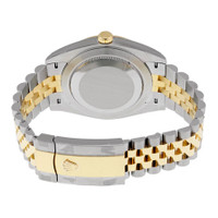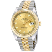 Stainless steel case with a stainless steel Rolex jubilee bracelet with 18kt yellow gold center links. Fixed fluted 18kt yellow gold bezel. Champagne dial with yellow gold-tone hands and diamond / Roman numeral hour markers. Minute markers around the outer rim. Dial Type: Analog. Date display at the 3 o'clock position. Rolex calibre 3235 automatic movement with a 70-hour power reserve. Scratch resistant sapphire crystal. Screw down crown. Solid case back. Case size: 41 mm. Round case shape. Concealed crown clasp. Water resistant at 100 meters / 330 feet. Functions: date, hour, minute, second, chronometer. Luxury watch style. Watch label: Swiss Made. Item Variations: 126333-62613. Rolex Datejust 41 Champagne Diamond Steel and 18K Yellow Gold Jubilee Men's Watch 126333CDJ. CASE Case Size: 41 Case Color: Silver-Tone Case Material: Stainless Steel Case Shape: Round Case Back: Solid BAND Band Material: Stainless Steel and 18kt Yellow Gold Rolex Jubilee Band Type: Bracelet Band Color: Silver-tone Clasp: Concealed Crown DIAL Dial Color: Champagne Type: Analog Crystal: Scratch Resistant Sapphire Hands: Yellow Gold-tone Dial Markers: Diamond / Roman Numeral Second Markers: Minute Markers around the outer rim Bezel: Fixed Fluted Bezel Material: 18kt Yellow Gold Crown: Screw Down INFORMATION Brand: Rolex Series: Datejust Collection Name: Datejust Gender: Mens Model: 126333CDJ Watch Label: Swiss Made Movement: Automatic Engine: Rolex Calibre 3235 Power Reserve: 70 hours FEATURES Water Resistance: 100 meters / 330 feet Calendar: Date display at the 3 o'clock position Functions: Date, Hour, Minute, Second, Chronometer Watch Features: Diamond, Stainless Steel, Gold, Chronometer, Analog ADDITIONAL INFO Watch Style: Luxury Warranty: 2 Year Jomashop Warranty UPC Code: 842047102961 Jomashop Sku: RLX126333CDJ Item Variation: 126333-62613, M126333-0012 Department: Watches Category: Watches