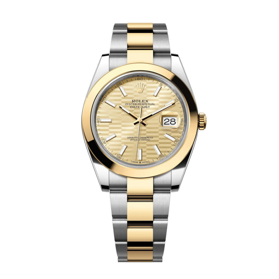 Stainless steel and 18kt yellow gold case with a stainless steel and 18kt yellow gold oyster bracelet. Fixed 18kt yellow gold bezel. Golden fluted motif dial with yellow gold hands and index hour markers. Dial Type: Analog. Luminescent hands and markers. Date display at the 3 o'clock position. Rolex Calibre 3235 Automatic movement, based upon Rolex 3035, containing 31 Jewels, bitting at 28800 vph, and has a power reserve of approximately 70 hours. Scratch resistant sapphire crystal. Screw down crown. Solid case back. Round case shape, case size: 41 mm. Folding oyster clasp. Water resistant at 100 meters / 330 feet. Functions: date, hour, minute, second. Datejust 41 Series. Luxury watch style. Watch label: Swiss Made. Rolex Datejust 41 Golden Fluted Motif Dial Automatic Men's Oyster Watch M126303-0021. GENERAL Box Type: Original Box CASE Case Diameter: 41 mm Case Material: Stainless Steel and 18kt Yellow Gold Case Shape: Round Case Back: Solid BAND Band Material: Stainless Steel and 18kt Yellow Gold Oyster Band Type: Bracelet Clasp: Folding Oysterclasp DIAL Dial Color: Golden Fluted Motif Type: Analog Crystal: Scratch Resistant Sapphire Hands: Yellow Gold Dial Markers: Index Luminiscence: Hands and Markers Bezel: Fixed Bezel Material: 18kt Yellow Gold Crown: Screw Down INFORMATION Brand: Rolex Series: Datejust Collection Name: Datejust Gender: Mens Model: M126303-0021 Watch Label: Swiss Made Movement: Automatic Engine: Rolex Calibre 3235 Power Reserve: 70 hours FEATURES Water Resistance: 100 meters / 330 feet Calendar: Date display at the 3 o'clock position Functions: Date, Hour, Minute, Second Watch Features: Analog, Gold, Stainless Steel ADDITIONAL INFO Watch Style: Luxury Warranty: 2 Year Jomashop Warranty Jomashop Sku: RLX126303-0021 Item Variation: 126303-0021 Department: Watches Category: Watches