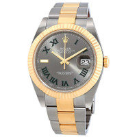 Stainless steel case with a stainless steel Rolex oyster bracelet with 18kt yellow gold center links. Fixed fluted 18kt yellow gold bezel. Grey dial with luminous yellow gold-tone hands and Roman numeral hour markers. Minute markers around the outer rim. Dial Type: Analog. Luminescent hands. Date display at the 3 o'clock position. Rolex calibre 3235 automatic movement with a 70-hour power reserve. Scratch resistant sapphire crystal. Screw down crown. Solid case back. Round case shape. Case size: 41 mm. Oysterlock clasp. Water resistant at 100 meters / 330 feet. Functions: date, hour, minute, second, chronometer. Luxury watch style. Watch label: Swiss Made. Rolex Datejust 41 Grey Dial Stainless Steel and 18K Yellow Gold Men's Watch 126333GYRO. GENERAL Box Type: Original Box CASE Case Diameter: 41 mm Case Color: Silver-Tone Case Material: Stainless Steel Case Shape: Round Case Back: Solid BAND Band Material: Stainless Steel and 18kt Yellow Gold Rolex Oyster Band Type: Bracelet Band Color: Two-tone (Silver-tone and Gold-tone) Clasp: Oysterlock DIAL Dial Color: Grey Type: Analog Crystal: Scratch Resistant Sapphire Hands: Luminous Yellow Gold-tone Dial Markers: Roman Numeral Second Markers: Minute Markers around the outer rim Luminiscence: Hands Bezel: Fixed Fluted Bezel Material: 18kt Yellow Gold Crown: Screw Down INFORMATION Brand: Rolex Series: Datejust Collection Name: Datejust Gender: Mens Model: M126333-0019 Watch Label: Swiss Made Movement: Automatic Engine: Rolex Calibre 3235 Power Reserve: 70 hours FEATURES Water Resistance: 100 meters / 330 feet Calendar: Date display at the 3 o'clock position Functions: Date, Hour, Minute, Second, Chronometer Watch Features: Analog, Chronometer, Gold, Stainless Steel ADDITIONAL INFO Watch Style: Luxury Warranty: 2 Year Jomashop Warranty UPC Code: 842047124642 Jomashop Sku: RLX126333GYRO Item Variation: 126333GYRO, 126333-0019 Department: Watches Category: Watches