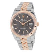 Stainless steel and 18kt everose gold case with a stainless steel and 18kt everose gold jubilee bracelet. Fixed 18kt everose gold bezel. Slate fluted motif dial with index hour markers. Dial Type: Analog. Luminescent hands and markers. Date display at the 3 o'clock position. Rolex Calibre 3235 Automatic movement, based upon Rolex 3035, containing 31 Jewels, bitting at 28800 vph, and has a power reserve of approximately 70 hours. Scratch resistant sapphire crystal. Screw down crown. Solid case back. Round case shape, case size: 41 mm. Folding oyster clasp. Water resistant at 100 meters / 330 feet. Functions: date, hour, minute, second. Datejust 41 Series. Luxury watch style. Watch label: Swiss Made. Rolex Datejust 41 Slate Fluted Motif Dial Automatic Men's Steel and 18kt Everose Gold Oyster Watch M126331-0020. CASE Case Size: 41 Case Material: Stainless Steel and 18kt Everose Gold Case Shape: Round Case Back: Solid BAND Band Material: Stainless Steel and 18kt Everose Gold Jubilee Band Type: Bracelet Clasp: Folding Oysterclasp DIAL Dial Color: Slate Fluted Motif Type: Analog Crystal: Scratch Resistant Sapphire Hands: Everose Gold Dial Markers: Index Luminiscence: Hands and Markers Bezel: Fixed Bezel Material: 18kt Everose Gold Crown: Screw Down INFORMATION Brand: Rolex Series: Datejust Collection Name: Datejust Gender: Mens Model: M126331-0020 Watch Label: Swiss Made Movement: Automatic Engine: Rolex Calibre 3235 FEATURES Water Resistance: 100 meters / 330 feet Calendar: Date display at the 3 o'clock position Functions: Date, Hour, Minute, Second Watch Features: Stainless Steel, Gold, Analog ADDITIONAL INFO Watch Style: Luxury Warranty: 2 Year Jomashop Warranty Jomashop Sku: RLX126331-0020 Item Variation: 126331-0020 Department: Watches Category: Watches