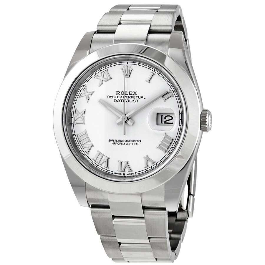 Stainless steel case with a stainless steel Rolex oyster bracelet. Fixed smooth stainless steel bezel. White dial with silver-tone hands and Roman numeral hour markers. Minute markers around the outer rim. Dial Type: Analog. Luminescent hands and markers. Date display at the 3 o'clock position. Rolex calibre 3235 automatic movement, based upon Rolex 3035, containing 31 Jewels, bitting at 28800 vph, and has a power reserve of approximately 70 hours. Scratch resistant sapphire crystal. Screw down crown. Solid case back. Round case shape. Case size: 41 mm. Fold over clasp with a safety release. Water resistant at 100 meters / 330 feet. Functions: date, hour, minute, second. Dress watch style. Watch label: Swiss Made. Rolex Datejust 41 White Dial Automatic Men's Oyster Watch 126300WSO. INFORMATION Brand: Rolex Series: Datejust Collection Name: Datejust Gender: Mens Model: 126300WRO Watch Label: Swiss Made Movement: Automatic Engine: Rolex Calibre 3235 Power Reserve: 70 hours CASE Case Size: 41 mm Case Color: Silver-Tone Case Material: Stainless Steel Case Shape: Round Case Back: Solid BAND Band Material: Stainless Steel Rolex Oyster Band Type: Bracelet Band Color: Silver-tone Clasp: Fold Over with Safety Release DIAL Dial Color: White Type: Analog Crystal: Scratch Resistant Sapphire Hands: Silver-tone Dial Markers: Roman Numeral Second Markers: Minute Markers around the outer rim Luminiscence: Hands and Markers Bezel: Fixed Smooth Bezel Color: Silver-tone Bezel Material: Stainless Steel Crown: Screw Down FEATURES Water Resistance: 100 meters / 330 feet Calendar: Date display at the 3 o'clock position Functions: Date, Hour, Minute, Second Watch Features: Stainless Steel, Analog ADDITIONAL INFO Watch Style: Dress Warranty: 2 Year Jomashop Warranty UPC Code: 842047181430 Jomashop Sku: RLX126300WRO Item Variation: m126300-0015 Department: Watches Category: Watches
