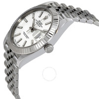 Stainless steel case with a stainless steel jubilee bracelet. Fixed fluted silver-tone 18kt white gold bezel. White dial with luminous silver-tone hands and index hour markers. Minute markers around the outer rim. Dial Type: Analog. Date display at the 3 o'clock position. Rolex calibre 3235 automatic movement with a 70-hour power reserve. Scratch resistant sapphire crystal. Screw down crown. Case size: 41 mm. Round case shape. Concealed crown clasp. Water resistant at 100 meters / 330 feet. Functions: date, hour, minute, second. Luxury watch style. Watch label: Swiss Made. Rolex Datejust 41 White Dial Automatic Men's Watch 126334WSJ. CASE Case Size: 41 Case Color: Silver-Tone Case Material: Stainless Steel Case Shape: Round Case Back: Solid BAND Band Material: Stainless Steel Jubilee Band Type: Bracelet Band Color: Silver-tone Clasp: Concealed Crown DIAL Dial Color: White Type: Analog Crystal: Scratch Resistant Sapphire Hands: Silver-tone Dial Markers: Index Second Markers: Minute Markers around the outer rim Luminiscence: Hands and Markers Bezel: Fixed Fluted Bezel Material: 18kt White Gold Crown: Screw Down INFORMATION Brand: Rolex Series: Datejust Collection Name: Datejust Gender: Mens Model: 126334-0010 Watch Label: Swiss Made Movement: Automatic Engine: Rolex Calibre 3235 Power Reserve: 70 hours FEATURES Water Resistance: 100 meters / 330 feet Calendar: Date display at the 3 o'clock position Functions: Date, Hour, Minute, Second Watch Features: Stainless Steel, Gold, Analog ADDITIONAL INFO Watch Style: Luxury Warranty: 2 Year Jomashop Warranty Jomashop Sku: RLX126334WSJ Item Variation: 126334WSJ, M126334-0010 Department: Watches Category: Watches