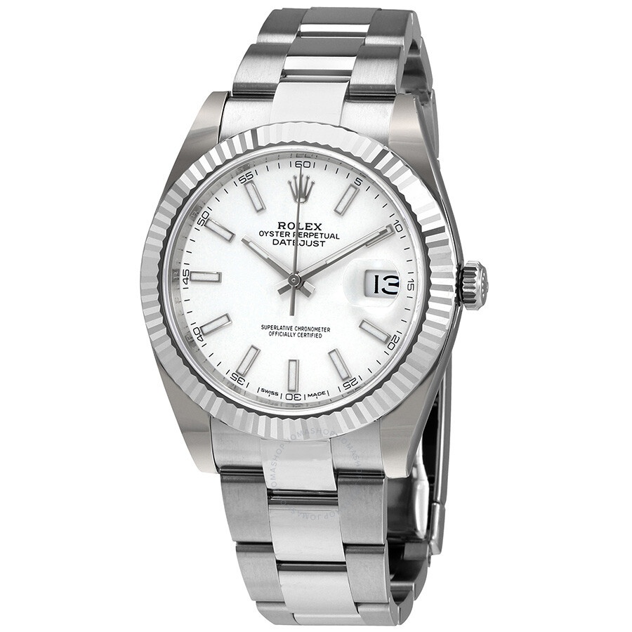 Stainless steel case with a stainless steel Rolex oyster bracelet. Fixed fluted 18kt white gold bezel. White dial with luminous silver-tone hands and index hour markers. Minute markers around the outer rim. Dial Type: Analog. Date display at the 3 o'clock position. Rolex calibre 3235 automatic movement with a 70-hour power reserve. Scratch resistant sapphire crystal. Screw down crown. Solid case back. Case size: 41 mm. Round case shape. Oysterlock clasp. Water resistant at 100 meters / 330 feet. Functions: date, hour, minute, second. Luxury watch style. Watch label: Swiss Made. Rolex Datejust 41 White Dial Oyster Automatic Men's Watch 126334WSO. CASE Case Size: 41 Case Color: Silvert-One Case Material: Stainless Steel Case Shape: Round Case Back: Solid BAND Band Material: Stainless Steel Rolex Oyster Band Type: Bracelet Band Color: Silver-tone Clasp: Oysterlock DIAL Dial Color: White Type: Analog Crystal: Scratch Resistant Sapphire Hands: Luminous Silver-tone Dial Markers: Index Second Markers: Minute Markers around the outer rim Luminiscence: Hands and Markers Bezel: Fixed Fluted Bezel Material: 18kt White Gold Crown: Screw Down INFORMATION Brand: Rolex Series: Datejust Collection Name: Datejust Gender: Mens Model: M126334-0009 Watch Label: Swiss Made Movement: Automatic Engine: Rolex Calibre 3235 Power Reserve: 70 hours FEATURES Water Resistance: 100 meters / 330 feet Calendar: Date display at the 3 o'clock position Functions: Date, Hour, Minute, Second Watch Features: Stainless Steel, Gold, Perpetual, Analog ADDITIONAL INFO Watch Style: Luxury Warranty: 2 Year Jomashop Warranty Jomashop Sku: RLX126334WSO Item Variation: 126334WSO, 126334-0009 Department: Watches Category: Watches