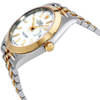 Silver-tone stainless steel case with a two-tone (silver-tone and yellow gold-tone) stainless steel and 18kt yellow gold rolex jubilee bracelet. Fixed 18kt yellow gold bezel. White dial with luminous yellow gold-tone hands and index hour markers. Minute markers around the outer rim. Dial Type: Analog. Luminescent hands and markers. Date display at the 3 o'clock position. Rolex Calibre 3235 Automatic movement, based upon Rolex 3035, containing 31 Jewels, bitting at 28800 vph, and has a power reserve of approximately 70 hours. Scratch resistant sapphire crystal. Screw down crown. Solid case back. Round case shape, case size: 41 mm. Oysterlock clasp. Water resistant at 100 meters / 330 feet. Functions: date, hour, minute, second, chronometer. Datejust 41 Series. Luxury watch style. Watch label: Swiss Made. Rolex Datejust 41 White Dial Steel and 18K Yellow Gold Jubilee Bracelet Men's Watch 126303WSJ. GENERAL Box Type: Original Box CASE Case Diameter: 41 mm Case Color: Silver-Tone Case Material: Stainless Steel Case Shape: Round Case Back: Solid BAND Band Material: Stainless Steel and 18kt Yellow Gold Rolex Jubilee Band Type: Bracelet Band Color: Two-tone (Silver-tone and Yellow Gold-tone) Clasp: Oysterlock DIAL Dial Color: White Type: Analog Crystal: Scratch Resistant Sapphire Hands: Luminous Yellow Gold-tone Dial Markers: Index Second Markers: Minute Markers around the outer rim Luminiscence: Hands and Markers Bezel: Fixed Bezel Material: 18kt Yellow Gold Crown: Screw Down INFORMATION Brand: Rolex Series: Datejust Collection Name: Datejust Gender: Mens Model: M126303-0016 Watch Label: Swiss Made Movement: Automatic Engine: Rolex Calibre 3235 Power Reserve: 70 hours FEATURES Water Resistance: 100 meters / 330 feet Calendar: Date display at the 3 o'clock position Functions: Date, Hour, Minute, Second, Chronometer Watch Features: Analog, Chronometer, Gold, Stainless Steel ADDITIONAL INFO Watch Style: Luxury Warranty: 2 Year Jomashop Warranty UPC Code: 842047112106 Jomashop Sku: RLX126303WSJ Item Variation: 126303WSJ, 126303-0016 Department: Watches Category: Watches