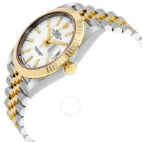 Stainless steel case with a stainless steel Rolex jubilee bracelet with 18kt yellow gold center links. Fixed fluted 18kt yellow gold bezel. White dial with luminous yellow gold-tone hands and index hour markers. Minute markers around the outer rim. Dial Type: Analog. Luminescent hands and markers. Date display at the 3 o'clock position. Rolex calibre 3235 automatic movement with a 70-hour power reserve. Scratch resistant sapphire crystal. Screw down crown. Solid case back. Round case shape. Case size: 41 mm. Concealed crown clasp. Water resistant at 100 meters / 330 feet. Functions: date, hour, minute, second, chronometer. Luxury watch style. Watch label: Swiss Made. Rolex Datejust 41 White Dial Steel and 18K Yellow Gold Jubilee Men's Watch 12633WSJ. GENERAL Box Type: Original Box CASE Case Diameter: 41 mm Case Color: Silver-Tone Case Material: Stainless Steel Case Shape: Round Case Back: Solid BAND Band Material: Stainless Steel with 18kt Yellow Gold Rolex Jubile Band Type: Bracelet Band Color: Two-tone (Silver-tone and Gold-tone) Clasp: Concealed Crown DIAL Dial Color: White Type: Analog Crystal: Scratch Resistant Sapphire Hands: Luminous Yellow Gold-tone Dial Markers: Index Second Markers: Minute Markers around the outer rim Luminiscence: Hands and Markers Bezel: Fixed Fluted Bezel Material: 18kt Yellow Gold Crown: Screw Down INFORMATION Brand: Rolex Series: Datejust Collection Name: Datejust Gender: Mens Model: M126333-0016 Watch Label: Swiss Made Movement: Automatic Engine: Rolex Calibre 3235 Power Reserve: 70 hours FEATURES Water Resistance: 100 meters / 330 feet Calendar: Date display at the 3 o'clock position Functions: Date, Hour, Minute, Second, Chronometer Watch Features: Analog, Chronometer, Gold, Stainless Steel ADDITIONAL INFO Watch Style: Luxury Warranty: 2 Year Jomashop Warranty UPC Code: 842047103623 Jomashop Sku: RLX126333WSJ Item Variation: 126333WSJ, 126333-0016 Department: Watches Category: Watches