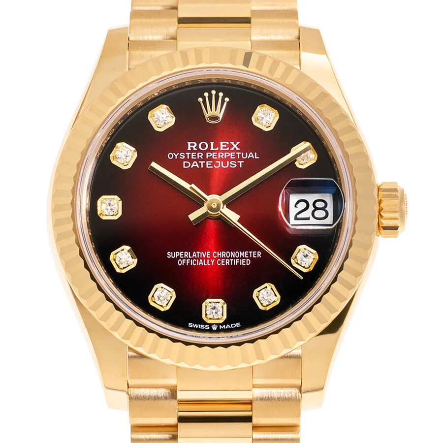 18kt yellow gold case with a 18kt yellow gold president bracelet. Fixed red ombre 18kt yellow gold bezel. Gold-tone hands and diamond hour markers. Dial Type: Analog. Date display at the 3 o'clock position. Rolex Calibre 2236 Automatic movement, based upon Rolex 2235, containing 31 Jewels, bitting at 28800 vph, and has a power reserve of approximately 55 hours. Scratch resistant sapphire crystal. Screw down crown. Solid case back. Round case shape, case size: 31 mm. Fold over clasp. Water resistant at 100 meters / 330 feet. Functions: date, hour, minute, second, chronometer. Datejust Series. Luxury watch style. Watch label: Swiss Made. Item Variations: 278278-0049. Rolex Datejust Automatic Chronometer Diamond Ladies Watch M278278-0049. GENERAL Box Type: Original Box CASE Case Diameter: 31 mm Case Material: 18kt Yellow Gold Case Shape: Round Case Back: Solid BAND Band Material: 18kt Yellow Gold President Band Type: Bracelet Clasp: Fold Over DIAL Type: Analog Crystal: Scratch Resistant Sapphire Hands: Gold-tone Dial Markers: Diamond Bezel: Fixed Bezel Color: Red Ombre Bezel Material: 18kt Yellow Gold Crown: Screw Down INFORMATION Brand: Rolex Series: Datejust Collection Name: Datejust Gender: Womens Model: M278278-0049 Watch Label: Swiss Made Movement: Automatic Engine: Rolex Calibre 2236 Power Reserve: 55 hours FEATURES Water Resistance: 100 meters / 330 feet Calendar: Date display at the 3 o'clock position Functions: Date, Hour, Minute, Second, Chronometer Watch Features: Analog, Chronometer, Gold, Diamond ADDITIONAL INFO Watch Style: Luxury Warranty: 2 Year Jomashop Warranty Jomashop Sku: RLX278278-0049 Item Variation: 278278-0049 Department: Watches