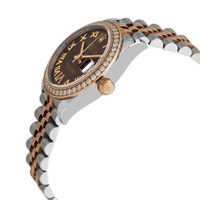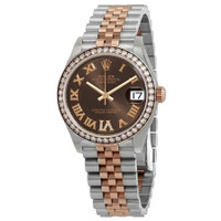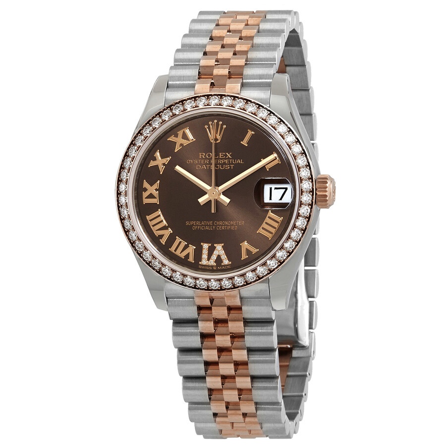 Stainless steel case with a stainless steel jubilee bracelet with everose gold center links. Fixed everose gold bezel set with diamonds. Chocolate dial with everose gold hands and Roman numeral hour markers. Diamond-set roman numeral appears at the 12 o'clock position. Dial Type: Analog. Date display at the 3 o'clock position. Rolex calibre 2236 automatic movement, based upon Rolex 2235, containing 31 Jewels, bitting at 28800 vph, and has a power reserve of approximately 55 hours. Scratch resistant sapphire crystal. Screw down crown. Solid case back. Round case shape. Case size: 31 mm. Crown fold over clasp. Water resistant at 100 meters / 330 feet. Functions: date, hour, minute, second. Datejust 31 Series. Luxury watch style. Watch label: Swiss Made. Rolex Datejust Chocolate Roman Dial Automatic Ladies Steel and Everose Gold Jubilee Watch 278381CHRDJ. INFORMATION Brand: Rolex Series: Datejust Collection Name: Datejust Gender: Womens Model: 278381CHRDJ Watch Label: Swiss Made Movement: Automatic Engine: Rolex Calibre 2236 Power Reserve: 55 hours CASE Case Size: 31 mm Case Material: Stainless Steel Case Shape: Round Case Back: Solid BAND Band Material: Stainless Steel with Everose Gold Jubilee Band Type: Bracelet Band Color: Silver-tone Clasp: Crown Fold Over DIAL Dial Color: Chocolate Type: Analog Crystal: Scratch Resistant Sapphire Hands: Everose Gold Dial Markers: Roman Numeral Second Markers: Diamond-set Roman Numeral appears at the 12 o'clock position Bezel: Fixed Bezel Material: Everose Gold set with Diamonds Crown: Screw Down FEATURES Water Resistance: 100 meters / 330 feet Calendar: Date display at the 3 o'clock position Functions: Date, Hour, Minute, Second Watch Features: Diamond, Stainless Steel, Gold, Analog ADDITIONAL INFO Watch Style: Luxury Warranty: 2 Year Jomashop Warranty Jomashop Sku: RLX278381CHRDJ Department: Watches Category: Watches