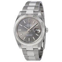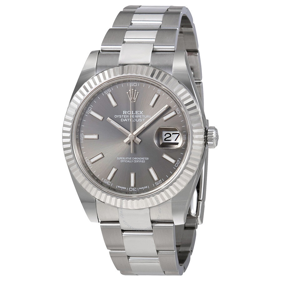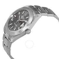 Stainless steel case with a stainless steel Rolex oyster bracelet. Fixed fluted 18kt white gold bezel. Dark rhodium dial with luminous silver-tone hands and index hour markers. Dial Type: Analog. Luminescent hands and markers. Date display at the 3 o'clock position. Rolex calibre 3235 automatic movement with a 70-hour power reserve. Scratch resistant sapphire crystal. Screw down crown. Solid case back. Case size: 41 mm. Round case shape. Oysterlock clasp. Water resistant at 100 meters / 330 feet. Functions: date, hour, minute, second. Luxury watch style. Watch label: Swiss Made. Rolex Datejust Dark Rhodium Automatic Men's Oyster Watch 126334RSO. CASE Case Size: 41 Case Color: Silver-Tone Case Material: Stainless Steel Case Shape: Round Case Back: Solid BAND Band Material: Stainless Steel Rolex Oyster Band Type: Bracelet Band Color: Silver-tone Clasp: Oysterlock DIAL Dial Color: Dark Rhodium Type: Analog Crystal: Scratch Resistant Sapphire Hands: Luminous Silver-tone Dial Markers: Index Luminiscence: Hands and Markers Bezel: Fixed Fluted Bezel Material: 18kt White Gold Crown: Screw Down INFORMATION Brand: Rolex Series: Datejust Collection Name: Datejust Gender: Mens Model: 126334 RSO Watch Label: Swiss Made Movement: Automatic Engine: Rolex Calibre 3235 Power Reserve: 70 hours FEATURES Water Resistance: 100 meters / 330 feet Calendar: Date display at the 3 o'clock position Functions: Date, Hour, Minute, Second Watch Features: Stainless Steel, Gold, Analog ADDITIONAL INFO Watch Style: Luxury Warranty: 2 Year Jomashop Warranty UPC Code: 842047124703 Jomashop Sku: RLX126334RSO Item Variation: m126334-0013 Department: Watches Category: Watches