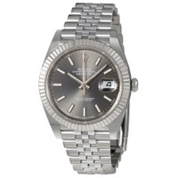 Stainless steel case with a stainless steel Rolex jubilee bracelet. Fixed fluted 18kt white gold bezel. Dark rhodium dial with silver-tone hands and index hour markers. Minute markers around the outer rim. Dial Type: Analog. Date display at the 3 o'clock position. Rolex calibre 3235 automatic movement with a 70-hour power reserve. Scratch resistant sapphire crystal. Screw down crown. Solid case back. Round case shape. Case size: 41 mm. Oysterlock clasp. Water resistant at 100 meters / 330 feet. Functions: date, hour, minute, second. Luxury watch style. Watch label: Swiss Made. Rolex Datejust Dark Rhodium Dial Automatic Men's Jubilee Watch 126334RSJ. CASE Case Size: 41 Case Color: Silver-Tone Case Material: Stainless Steel Case Shape: Round Case Back: Solid BAND Band Material: Stainless Steel Rolex Jubilee Band Type: Bracelet Band Color: Silver-tone Clasp: Oysterlock DIAL Dial Color: Dark Rhodium Type: Analog Crystal: Scratch Resistant Sapphire Hands: Silver-tone Dial Markers: Index Second Markers: Minute Markers around the outer rim Bezel: Fixed Fluted Bezel Material: 18kt White Gold Crown: Screw Down INFORMATION Brand: Rolex Series: Datejust Collection Name: Datejust Gender: Mens Model: 126334RSJ Watch Label: Swiss Made Movement: Automatic Engine: Rolex Calibre 3235 Power Reserve: 70 hours FEATURES Water Resistance: 100 meters / 330 feet Calendar: Date display at the 3 o'clock position Functions: Date, Hour, Minute, Second Watch Features: Stainless Steel, Gold, Analog ADDITIONAL INFO Watch Style: Luxury Warranty: 2 Year Jomashop Warranty UPC Code: 842047124697 Jomashop Sku: RLX126334RSJ Item Variation: m126334-0014 Department: Watches Category: Watches