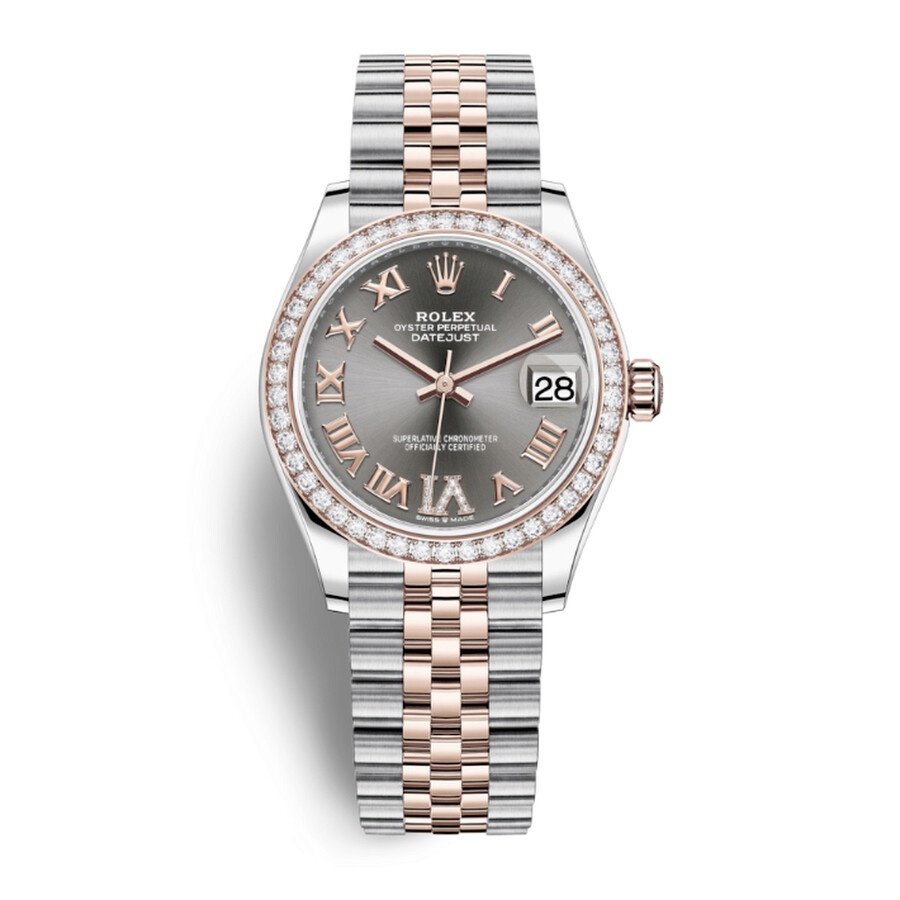 Stainless steel and everose gold case with a stainless steel and everose gold jubilee bracelet. Fixed- diamond set everose gold bezel. Dark rhodium dial with everose gold hands and Roman- diamond numerals hour markers. Dial Type: Analog. Date display at the 3 o'clock position. Rolex Calibre 2236 Automatic movement, based upon Rolex 2235, containing 31 Jewels, bitting at 28800 vph, and has a power reserve of approximately 55 hours. Scratch resistant sapphire crystal. Screw down crown. Solid case back. Round case shape. Case size: 31 mm. Crown clasp. Water resistant at 100 meters / 330 feet. Functions: date, hour, minute, second. Luxury watch style. Watch label: Swiss Made. Rolex Datejust Dark Rhodium Roman Dial Automatic Ladies Steel and Everose Gold Jubilee Watch 278381DRRDJ. INFORMATION Brand: Rolex Series: Datejust Collection Name: Datejust Gender: Womens Model: 278381DRRDJ Watch Label: Swiss Made Movement: Automatic Engine: Rolex Calibre 2236 Power Reserve: 55 hours CASE Case Size: 31 mm Case Material: Stainless Steel and Everose Gold Case Shape: Round Case Back: Solid BAND Band Material: Stainless Steel and Everose Gold Jubilee Band Type: Bracelet Band Color: Two-tone (Silver-tone and Rose Gold-tone) Clasp: Crownclasp DIAL Dial Color: Dark Rhodium Type: Analog Crystal: Scratch Resistant Sapphire Hands: Everose Gold Dial Markers: Roman- Diamond Numerals Bezel: Fixed- Diamond Set Bezel Material: Everose Gold Crown: Screw Down FEATURES Water Resistance: 100 meters / 330 feet Calendar: Date display at the 3 o'clock position Functions: Date, Hour, Minute, Second Watch Features: Diamond, Stainless Steel, Gold, Analog ADDITIONAL INFO Watch Style: Luxury Warranty: 2 Year Jomashop Warranty Jomashop Sku: RLX278381DRRDJ Department: Watches Category: Watches