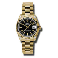 18kt yellow gold (diamond-set lugs) case with a yellow gold-tone 18kt yellow gold rolex president bracelet. Fixed fluted 18kt yellow gold bezel. Black dial with yellow gold-tone hands and index hour markers. Minute markers around the outer rim. Dial Type: Analog. Date display at the 3 o'clock position. Rolex Calibre 2235 Automatic movement, containing 31 Jewels, bitting at 28800 vph, and has a power reserve of approximately 48 hours. Scratch resistant sapphire crystal. Screw down crown. Solid case back. Round case shape, case size: 31 mm. Concealed crown clasp. Water resistant at 100 meters / 330 feet. Functions: date, hour, minute, second, chronometer. Additional Info: 24 diamonds set on lugs. Datejust Lady 31 Series. Luxury watch style. Watch label: Swiss Made. Rolex Datejust Lady 31 Black Dial 18K Yellow Gold President Automatic Ladies Watch 178238BKSP. GENERAL Color: Black / Gold / Yellow INFORMATION Brand: Rolex Series: Datejust Lady 31 Collection Name: Datejust Lady 31 Gender: Womens Model: 178238BKSP Watch Label: Swiss Made Movement: Automatic Engine: Rolex Calibre 2235 Power Reserve: 48 hours CASE Case Size: 31 mm Case Material: 18kt Yellow Gold (Diamond-Set Lugs) Case Shape: Round Case Back: Solid BAND Band Material: 18kt Yellow Gold Rolex President Band Type: Bracelet Band Color: Yellow Gold-tone Clasp: Concealed Crown DIAL Dial Color: Black Type: Analog Crystal: Scratch Resistant Sapphire Hands: Yellow Gold-Tone Dial Markers: Index Second Markers: Minute Markers around the outer rim Luminiscence: Hands and Markers Bezel: Fixed Fluted Bezel Material: 18kt Yellow Gold Crown: Screw Down FEATURES Water Resistance: 100 meters / 330 feet Calendar: Date display at the 3 o'clock position Functions: Date, Hour, Minute, Second, Chronometer Watch Features: Diamond, Gold, Chronometer, Analog ADDITIONAL INFO Watch Style: Luxury Warranty: 2 Year Jomashop Warranty UPC Code: 845960077194 Additional Info: 24 Diamonds Set on Lugs Jomashop Sku: RLX178238BKSP Department: Watches Category: Watches