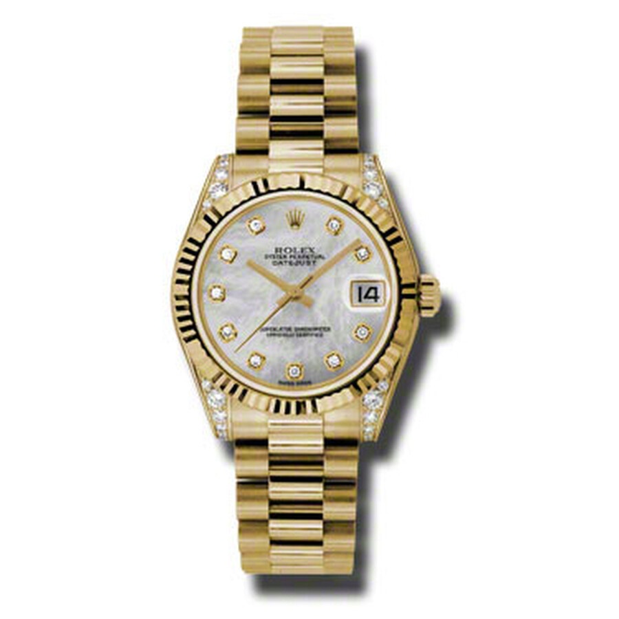 18kt yellow gold (diamond-set lugs) case with a yellow gold-tone 18kt yellow gold rolex president bracelet. Fixed fluted 18kt yellow gold bezel. Mother of pearl dial with yellow gold-tone hands and diamond hour markers. Dial Type: Analog. Date display at the 3 o'clock position. Rolex Calibre 2235 Automatic movement, containing 31 Jewels, bitting at 28800 vph, and has a power reserve of approximately 48 hours. Scratch resistant sapphire crystal. Screw down crown. Solid case back. Round case shape, case size: 31 mm. Concealed crown clasp. Water resistant at 100 meters / 330 feet. Functions: date, hour, minute, second, chronometer. Additional Info: 24 diamonds set on lugs. Datejust Lady 31 Series. Luxury watch style. Watch label: Swiss Made. Rolex Datejust Lady 31 Mother Of Pearl Dial 18K Yellow Gold President Automatic Ladies Watch 178238MDP. GENERAL Color: Gold / Mother of pearl / Yellow INFORMATION Brand: Rolex Series: Datejust Lady 31 Collection Name: Datejust Lady 31 Gender: Womens Model: 178238MDP Watch Label: Swiss Made Movement: Automatic Engine: Rolex Calibre 2235 Power Reserve: 48 hours CASE Case Size: 31 mm Case Material: 18kt Yellow Gold (Diamond-Set Lugs) Case Shape: Round Case Back: Solid BAND Band Material: 18kt Yellow Gold Rolex President Band Type: Bracelet Band Color: Yellow Gold-tone Clasp: Concealed Crown DIAL Dial Color: Mother Of Pearl Type: Analog Crystal: Scratch Resistant Sapphire Hands: Yellow Gold-Tone Dial Markers: Diamond Bezel: Fixed Fluted Bezel Material: 18kt Yellow Gold Crown: Screw Down FEATURES Water Resistance: 100 meters / 330 feet Calendar: Date display at the 3 o'clock position Functions: Date, Hour, Minute, Second, Chronometer Watch Features: Diamond, Gold, Chronometer, Analog ADDITIONAL INFO Watch Style: Luxury Warranty: 2 Year Jomashop Warranty UPC Code: 845960077255 Additional Info: 24 Diamonds Set on Lugs Jomashop Sku: RLX178238MDP Department: Watches Category: Watches
