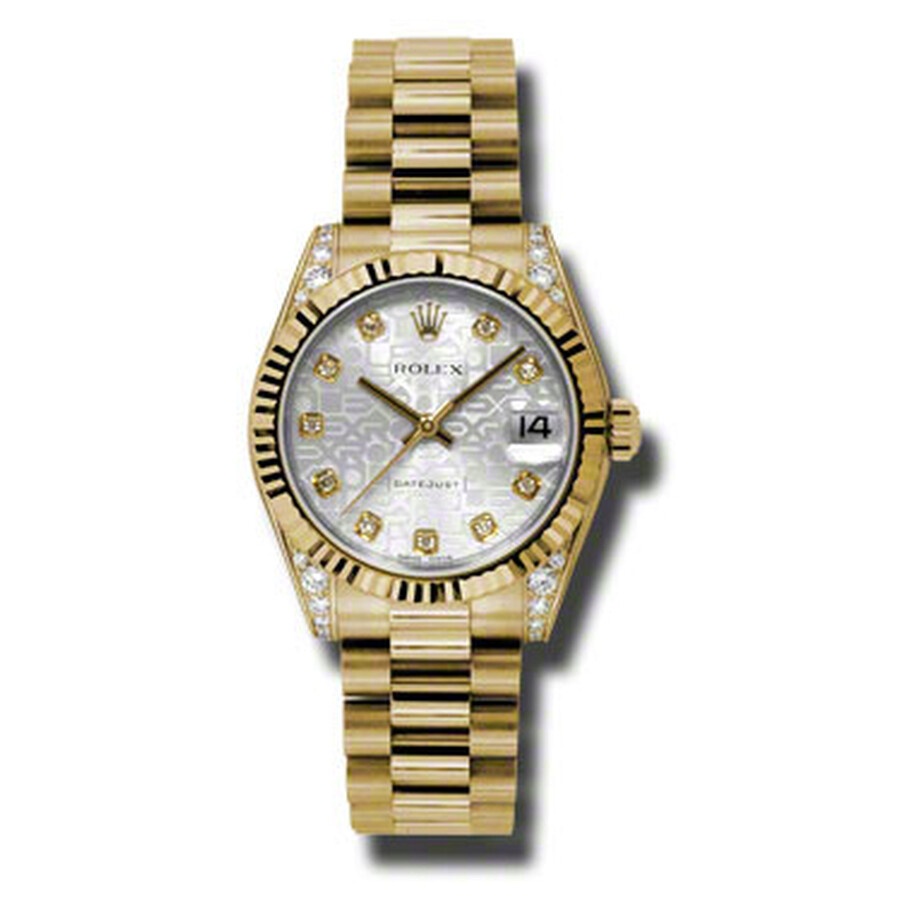 18kt yellow gold (diamond-set lugs) case with a yellow gold-tone 18kt yellow gold rolex president bracelet. Fixed fluted 18kt yellow gold bezel. Silver jubilee dial with yellow gold-tone hands and diamond hour markers. Dial Type: Analog. Date display at the 3 o'clock position. Rolex Calibre 2235 Automatic movement, containing 31 Jewels, bitting at 28800 vph, and has a power reserve of approximately 48 hours. Scratch resistant sapphire crystal. Screw down crown. Solid case back. Round case shape, case size: 31 mm. Concealed crown clasp. Water resistant at 100 meters / 330 feet. Functions: date, hour, minute, second, chronometer. Additional Info: 24 diamonds set on lugs. Datejust Lady 31 Series. Luxury watch style. Watch label: Swiss Made. Rolex Datejust Lady 31 Silver Dial 18K Yellow Gold President Automatic Ladies Watch 178238SJDP. GENERAL Color: Gold / Silver / Yellow INFORMATION Brand: Rolex Series: Datejust Lady 31 Collection Name: Datejust Lady 31 Gender: Womens Model: 178238SJDP Watch Label: Swiss Made Movement: Automatic Engine: Rolex Calibre 2235 Power Reserve: 48 hours CASE Case Size: 31 mm Case Material: 18kt Yellow Gold (Diamond-Set Lugs) Case Shape: Round Case Back: Solid BAND Band Material: 18kt Yellow Gold Rolex President Band Type: Bracelet Band Color: Yellow Gold-tone Clasp: Concealed Crown DIAL Dial Color: Silver Jubilee Type: Analog Crystal: Scratch Resistant Sapphire Hands: Yellow Gold-Tone Dial Markers: Diamond Bezel: Fixed Fluted Bezel Material: 18kt Yellow Gold Crown: Screw Down FEATURES Water Resistance: 100 meters / 330 feet Calendar: Date display at the 3 o'clock position Functions: Date, Hour, Minute, Second, Chronometer Watch Features: Diamond, Gold, Chronometer, Analog ADDITIONAL INFO Watch Style: Luxury Warranty: 2 Year Jomashop Warranty UPC Code: 845960077262 Additional Info: 24 Diamonds Set on Lugs Jomashop Sku: RLX178238SJDP Department: Watches Category: Watches