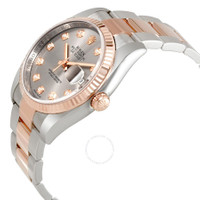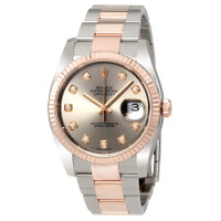 Stainless steel case with a stainless steel Rolex oyster bracelet with 18kt everose gold center links. Fixed fluted 18kt everose gold bezel. Rhodium dial with rose gold-tone hands and diamond hour markers. Dial Type: Analog. Date display at the 3 o'clock position. Rolex calibre 3135 automatic movement with a 48-hour power reserve. Scratch resistant sapphire crystal. Screw down crown. Solid case back. Case size: 36 mm. Round case shape. Oysterlock clasp. Water resistant at 100 meters / 330 feet. Functions: date, hour, minute, second. Luxury watch style. Watch label: Swiss Made. Rolex Datejust Rhodium Dial Steel and 18K Everose Gold Diamond Men's Watch 116231RDO. CASE Case Size: 36 Case Color: Silver-Tone Case Material: Stainless Steel Case Shape: Round Case Back: Solid BAND Band Material: Stainless Steel and 18kt Everose Gold Rolex Oyster Band Type: Bracelet Band Color: Two-tone (Silver-tone and Gold-tone) Clasp: Oysterlock DIAL Dial Color: Rhodium Type: Analog Crystal: Scratch Resistant Sapphire Hands: Rose Gold-tone Dial Markers: Diamond Bezel: Fixed Fluted Bezel Material: 18kt Everose Gold Crown: Screw Down INFORMATION Brand: Rolex Series: Datejust Collection Name: Datejust Gender: Mens Model: 116231RDO Watch Label: Swiss Made Movement: Automatic Engine: Rolex Calibre 3135 Power Reserve: 48 hours FEATURES Water Resistance: 100 meters / 330 feet Calendar: Date display at the 3 o'clock position Functions: Date, Hour, Minute, Second, Chronometer Watch Features: Diamond, Stainless Steel, Gold, Chronometer, Analog ADDITIONAL INFO Watch Style: Luxury Warranty: 2 Year Jomashop Warranty UPC Code: 842047104873 Jomashop Sku: RLX116231RDO Department: Watches Category: Watches