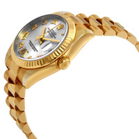 18kt yellow gold case with a 18kt yellow gold rolex president bracelet. Fixed bezel. Silver dial with yellow gold hands and Roman numeral hour markers. Dial Type: Analog. Date display at the 3 o'clock position. Rolex Calibre 2235 automatic movement with a 50-hour power reserve. Scratch resistant sapphire crystal. Screw down crown. Solid case back. Round case shape. Case size: 31 mm. Water resistant at 100 meters / 330 feet. Functions: date, hour, minute, second. Luxury watch style. Watch label: Swiss Made. Rolex Datejust Silver Diamond Dial Automatic Ladies 18kt Yellow Gold President Watch 178278SRDP. INFORMATION Brand: Rolex Series: Datejust Collection Name: Datejust Gender: Womens Model: 178278SRDP Watch Label: Swiss Made Movement: Automatic Engine: Rolex Calibre 2235 Power Reserve: 50 hours CASE Case Size: 31 mm Case Material: 18kt Yellow Gold Case Shape: Round Case Back: Solid BAND Band Material: 18kt Yellow Gold Rolex President Band Type: Bracelet Clasp: Crownclasp DIAL Dial Color: Silver Type: Analog Crystal: Scratch Resistant Sapphire Hands: Yellow Gold Dial Markers: Roman Numeral Bezel: Fixed Bezel Material: 18kt Yellow Gold Crown: Screw Down FEATURES Water Resistance: 100 meters / 330 feet Calendar: Date display at the 3 o'clock position Functions: Date, Hour, Minute, Second Watch Features: Diamond, Gold, Analog ADDITIONAL INFO Watch Style: Luxury Warranty: 2 Year Jomashop Warranty UPC Code: 842047140208 Jomashop Sku: RLX178278SRDP Department: Watches Category: Watches
