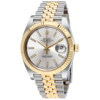 Stainless steel case with a stainless steel Rolex Jubilee bracelet with 18kt yellow gold center links. Fixed fluted 18kt yellow gold bezel. Silver dial with luminous yellow gold hands and index hour markers. Minute markers around the outer rim. Dial Type: Analog. Date display at the 3 o'clock position. Rolex calibre 3235 automatic movement with a 70-hour power reserve. Scratch resistant sapphire crystal. Screw down crown. Solid case back. Case size: 41 mm. Round case shape. Concealed crown clasp. Water resistant at 100 meters / 330 feet. Functions: date, hour, minute, second. Luxury watch style. Watch label: Swiss Made. Rolex Datejust41 Silver Dial Steel and 18K Yellow Gold Jubilee Men's Watch 126333SSJ. CASE Case Size: 41 Case Color: Silver-Tone Case Material: Stainless Steel Case Shape: Round Case Back: Solid BAND Band Material: Stainless Steel and 18kt Yellow Gold Rolex Jubilee Band Type: Bracelet Band Color: Silver-tone Clasp: Concealed Crown DIAL Dial Color: Silver Type: Analog Crystal: Scratch Resistant Sapphire Hands: Luminous Yellow Gold Dial Markers: Index Second Markers: Minute Markers around the outer rim Luminiscence: Hands and Markers Bezel: Fixed Fluted Bezel Material: 18kt Yellow Gold Crown: Screw Down INFORMATION Brand: Rolex Series: Datejust Collection Name: Datejust Gender: Mens Model: M126333-0002 Watch Label: Swiss Made Movement: Automatic Engine: Rolex Calibre 3235 Power Reserve: 70 hours FEATURES Water Resistance: 100 meters / 330 feet Calendar: Date display at the 3 o'clock position Functions: Date, Hour, Minute, Second, Chronometer Watch Features: Analog, Chronometer, Gold, Stainless Steel ADDITIONAL INFO Watch Style: Luxury Warranty: 2 Year Jomashop Warranty UPC Code: 842047102954 Jomashop Sku: RLX126333SSJ Item Variation: 126333SSJ, 126333-0002 Department: Watches Category: Watches
