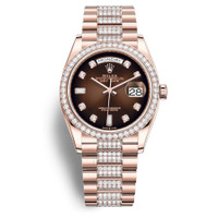 18kt everose gold case with a 18kt everose gold diamond-set president bracelet. Fixed fluted 18kt everose gold bezel. Chocolate dial with everose gold hands and diamond hour markers. Minute markers around the outer rim. Dial Type: Analog. Date display at 3 o'clock; day display at 12 o'clock.. Rolex Calibre 3255 Automatic movement, based upon Rolex 3035, containing 31 Jewels, bitting at 28800 vph, and has a power reserve of approximately 70 hours. Scratch resistant sapphire crystal. Screw down crown. Solid case back. Round case shape. Case size: 36 mm. Concealed crown clasp. Water resistant at 100 meters / 330 feet. Functions: date, day, hour, minute, second, chronometer. Luxury watch style. Watch label: Swiss Made. Rolex Day-Date 36 Chocolate Dial 18kt Everose Gold Diamond-Set President Watch 128345CHDDP. INFORMATION Brand: Rolex Series: Day-Date Collection Name: Day-Date Gender: Womens Model: 128345CHDDP Watch Label: Swiss Made Movement: Automatic Engine: Rolex Calibre 3255 Power Reserve: 48 hours CASE Case Size: 36 mm Case Material: 18kt Everose Gold Case Shape: Round Case Back: Solid BAND Band Material: 18kt Everose Gold Diamond-Set President Band Type: Bracelet Clasp: Concealed Crown DIAL Dial Color: Chocolate Type: Analog Crystal: Scratch Resistant Sapphire Hands: Everose Gold Dial Markers: Diamond Second Markers: Minute Markers around the outer rim Bezel: Fixed Fluted Bezel Material: 18kt Everose Gold Crown: Screw Down FEATURES Water Resistance: 100 meters / 330 feet Calendar: Date display at 3 o'clock; Day Display at 12 o'clock. Functions: Date, Day, Hour, Minute, Second, Chronometer Watch Features: Diamond, Gold, Chronometer, Analog ADDITIONAL INFO Watch Style: Luxury Warranty: 2 Year Jomashop Warranty Jomashop Sku: RLX128345CHDDP Department: Watches Category: Watches