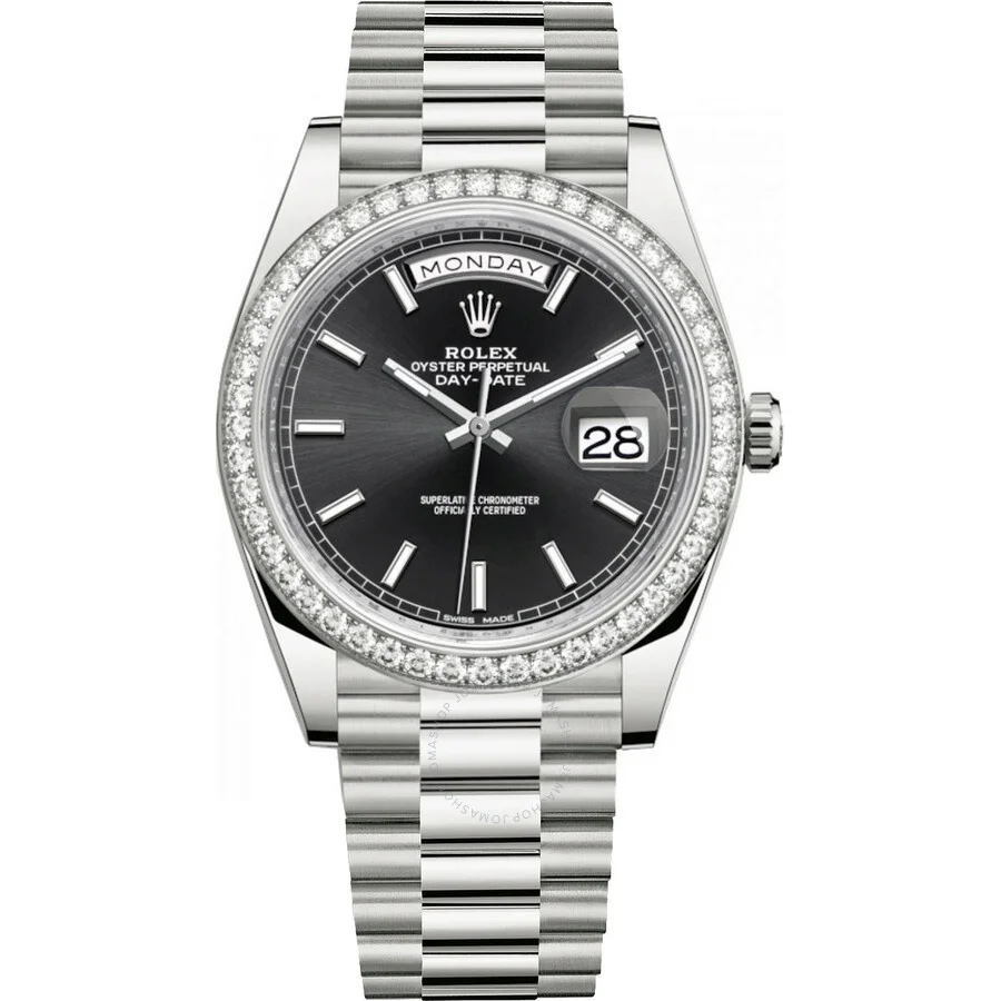 18kt white gold case with a 18kt white gold bracelet. Fixed- diamond set bezel. Black dial with silver-tone hands and index hour markers. Dial Type: Analog. Date display at the 3 o'clock position. Rolex Calibre 3255 Automatic movement, based upon Rolex 3035, containing 31 Jewels, bitting at 28800 vph, and has a power reserve of approximately 70 hours. Scratch resistant sapphire crystal. Screw down crown. Solid case back. Round case shape, case size: 40 mm. Folding clasp. Water resistant at 100 meters / 330 feet. Functions: date, day, hour, minute, second. Day Date 40 Series. Luxury watch style. Watch label: Swiss Made. Rolex Day Date 40 Automatic Black Dial Men's 18kt White Gold Watch 228349BKSP. CASE Case Size: 40 Case Material: 18kt White Gold Case Shape: Round Case Back: Solid BAND Band Material: 18kt White Gold President Band Type: Bracelet Clasp: Folding DIAL Dial Color: Black Type: Analog Crystal: Scratch Resistant Sapphire Hands: Silver-tone Dial Markers: Index Bezel: Fixed- Diamond Set Crown: Screw Down INFORMATION Brand: Rolex Series: Day-Date Collection Name: Day-Date Gender: Mens Model: 228349BKSP Watch Label: Swiss Made Movement: Automatic Engine: Rolex Calibre 3255 Power Reserve: 70 hours FEATURES Water Resistance: 100 meters / 330 feet Calendar: Date display at the 3 o'clock position Functions: Date, Day, Hour, Minute, Second Watch Features: Diamond, Gold, Analog ADDITIONAL INFO Watch Style: Luxury Warranty: 2 Year Jomashop Warranty Jomashop Sku: RLX228349BKSP Department: Watches Category: Watches