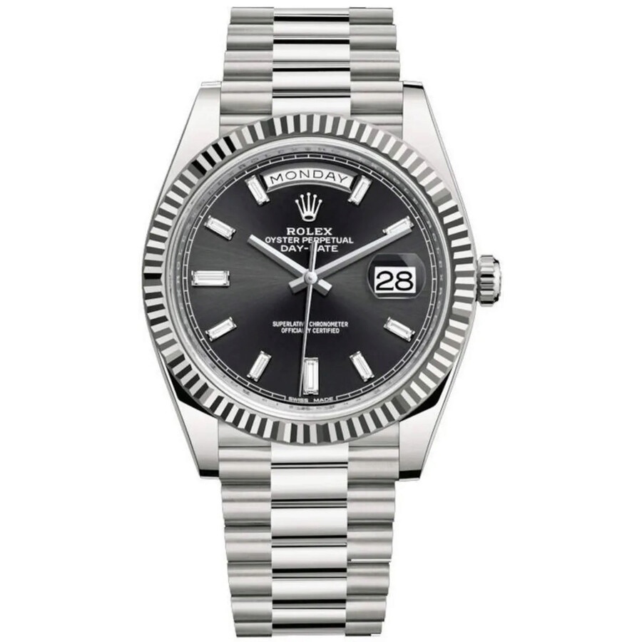 18kt white gold case with a 18kt white gold rolex president bracelet. Fixed-fluted 18kt white gold bezel. Black dial with silver-tone hands and baguette-cut diamonds hour markers. Dial Type: Analog. Date display at the 3 o'clock position. Rolex Calibre 3255 automatic movement with a 70-hour power reserve. Scratch resistant sapphire crystal. Screw down crown. Solid case back. Round case shape. Case size: 40 mm. Water resistant at 100 meters / 330 feet. Functions: date, hour, minute, second. Luxury watch style. Watch label: Swiss Made. Rolex Day-Date 40 Automatic Black Diamond Dial Men's 18K White Gold President Watch 228239BKDP. CASE Case Size: 40 Case Material: 18kt White Gold Case Shape: Round Case Back: Solid BAND Band Material: 18kt White Gold Rolex President Band Type: Bracelet Clasp: Crownclasp DIAL Dial Color: Black Type: Analog Crystal: Scratch Resistant Sapphire Hands: Silver-tone Dial Markers: Baguette-cut Diamonds Bezel: Fixed Fluted Bezel Material: 18kt White Gold Crown: Screw Down INFORMATION Brand: Rolex Series: Day-Date 40 Collection Name: Day-Date 40 Gender: Mens Model: 228239BKDP Watch Label: Swiss Made Movement: Automatic Engine: Rolex Calibre 3255 Power Reserve: 70 hours FEATURES Water Resistance: 100 meters / 330 feet Calendar: Date display at the 3 o'clock position Functions: Date, Hour, Minute, Second Watch Features: Diamond, Gold, Analog ADDITIONAL INFO Watch Style: Luxury Warranty: 2 Year Jomashop Warranty Jomashop Sku: RLX228239BKDP Item Variation: m228239-0005 Department: Watches Category: Watches