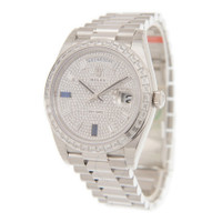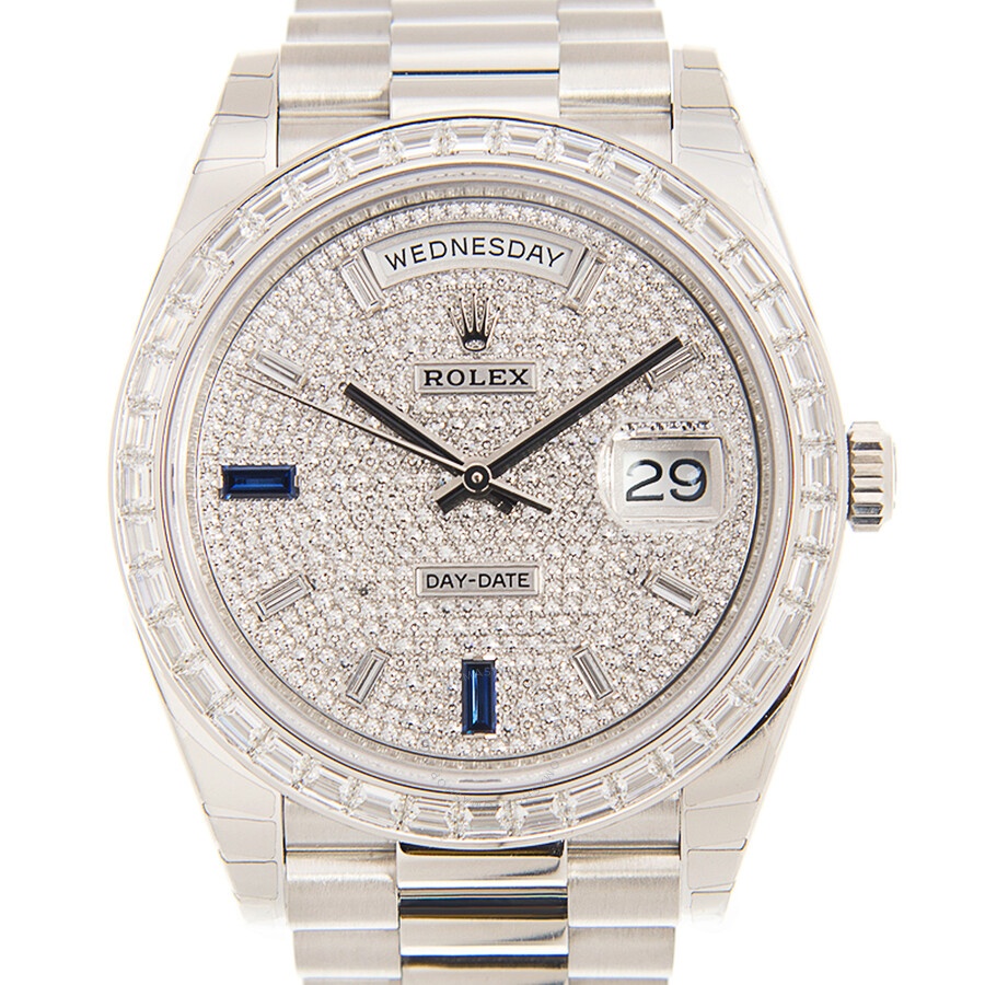 White platinum case with a white platinum rolex president bracelet. Fixed white bezel with diamond set. Pave dial with gold-tone hands and baguette diamond hour markers. Minute markers around the outer rim. Dial Type: Analog. Date display at 3 o'clock; day display at 12 o'clock. Rolex Calibre 3255 Automatic movement, based upon Rolex 3035, containing 31 Jewels, bitting at 28800 vph, and has a power reserve of approximately 70 hours. Scratch resistant sapphire crystal. Screw down crown. Solid case back. Round case shape, case size: 40 mm. Concealed crown clasp. Water resistant at 100 meters / 330 feet. Functions: date, day, hour, minute, second, chronometer. Day-date 40 Series. Luxury watch style. Watch label: Swiss Made. Rolex Day-Date 40 Automatic Chronometer Diamond-Pave Dial Men's Watch 228396tbr-0021. CASE Case Size: 40 Case Material: Platinum Case Shape: Round Case Back: Solid BAND Band Material: Platinum Rolex President Band Type: Bracelet Band Color: White Clasp: Concealed Crown DIAL Dial Color: Pave Type: Analog Crystal: Scratch Resistant Sapphire Hands: Gold-tone Dial Markers: Baguette Diamond Second Markers: Minute Markers around the outer rim Bezel: Fixed Bezel Color: White Bezel Material: Diamond Set Crown: Screw Down INFORMATION Brand: Rolex Series: Day-Date 40 Collection Name: Day-Date 40 Gender: Mens Model: 228396tbr-0021 Watch Label: Swiss Made Movement: Automatic Engine: Rolex Calibre 3255 Power Reserve: 70 hours FEATURES Water Resistance: 100 meters / 330 feet Calendar: Date display at 3 o'clock; Day Display at 12 o'clock. Functions: Date, Day, Hour, Minute, Second, Chronometer Watch Features: Diamond, Gold, Chronometer, Platinum, Analog ADDITIONAL INFO Watch Style: Luxury Warranty: 2 Year Jomashop Warranty Jomashop Sku: RLX228396PAVEP Item Variation: M228396TBR-0021 Department: Watches Category: Watches