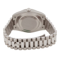 18kt white gold case with a 18kt white gold president bracelet. Fixed- diamond set bezel. Green dial with silver-tone hands and Roman numeral hour markers. Dial Type: Analog. Date display at the 3 o'clock position. Rolex Calibre 3255 Automatic movement, based upon Rolex 3035, containing 31 Jewels, bitting at 28800 vph, and has a power reserve of approximately 70 hours. Scratch resistant sapphire crystal. Screw down crown. Solid case back. Round case shape, case size: 40 mm. Folding clasp. Water resistant at 100 meters / 330 feet. Functions: date, day, hour, minute, second. Day Date 40 Series. Luxury watch style. Watch label: Swiss Made. Rolex Day Date 40 Automatic Green Dial Men's 18kt White Gold President Watch 228349GNRP. CASE Case Size: 40 mm Case Material: 18kt White Gold Case Shape: Round Case Back: Solid BAND Band Material: 18kt White Gold President Band Type: Bracelet Clasp: Folding DIAL Dial Color: Green Type: Analog Crystal: Scratch Resistant Sapphire Hands: Silver-tone Dial Markers: Roman Numeral Second Markers: Minute Markers around the outer rim Bezel: Fixed- Diamond Set Bezel Material: 18kt White Gold Crown: Screw Down INFORMATION Brand: Rolex Series: Day-Date Collection Name: Day-Date Gender: Mens Model: M228349RBR-0030 Watch Label: Swiss Made Movement: Automatic Engine: Rolex Calibre 3255 Power Reserve: 70 hours FEATURES Water Resistance: 100 meters / 330 feet Calendar: Date display at the 3 o'clock position Functions: Date, Day, Hour, Minute, Second Watch Features: Diamond, Gold, Analog ADDITIONAL INFO Watch Style: Luxury Warranty: 2 Year Jomashop Warranty Jomashop Sku: RLX228349GNRP Item Variation: 228349RBR-0030,228349GNRP Department: Watches Category: Watches
