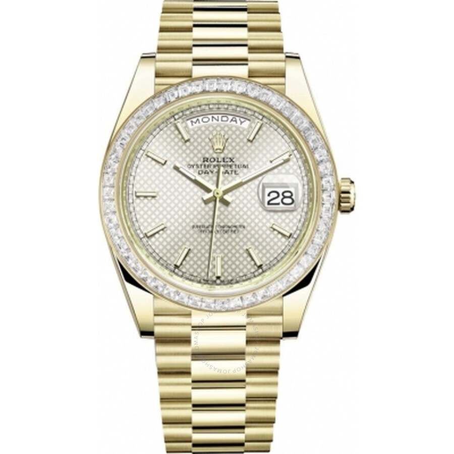 18kt yellow gold case with a 18kt yellow gold rolex president bracelet. Fixed- diamond set 18kt yellow gold bezel. Silver diagonal-motif dial with yellow gold hands and index hour markers. Dial Type: Analog. Date display at the 3 o'clock position. Rolex Calibre 3255 Automatic movement, based upon Rolex 3035, containing 31 Jewels, bitting at 28800 vph, and has a power reserve of approximately 70 hours. Scratch resistant sapphire crystal. Screw down crown. Solid case back. Round case shape, case size: 40 mm. Folding clasp. Water resistant at 100 meters / 330 feet. Functions: date, hour, minute, second. Day Date 40 Series. Luxury watch style. Watch label: Swiss Made. Rolex Day Date 40 Automatic Silver Diagonal-Motif Dial Men's 18kt Yellow Gold President Watch 228398SSP. CASE Case Size: 40 Case Material: 18kt Yellow Gold Case Shape: Round Case Back: Solid BAND Band Material: 18kt Yellow Gold Rolex President Band Type: Bracelet Clasp: Folding DIAL Dial Color: Silver Diagonal-Motif Type: Analog Crystal: Scratch Resistant Sapphire Hands: Yellow Gold Dial Markers: Index Bezel: Fixed- Diamond Set Bezel Material: 18kt Yellow Gold Crown: Screw Down INFORMATION Brand: Rolex Series: Day-Date Collection Name: Day-Date Gender: Mens Model: 228398SSP Watch Label: Swiss Made Movement: Automatic Engine: Rolex Calibre 3255 Power Reserve: 70 hours FEATURES Water Resistance: 100 meters / 330 feet Calendar: Date display at the 3 o'clock position Functions: Date, Hour, Minute, Second Watch Features: Diamond, Gold, Analog ADDITIONAL INFO Watch Style: Luxury Warranty: 2 Year Jomashop Warranty Jomashop Sku: RLX228398SSP Department: Watches Category: Watches