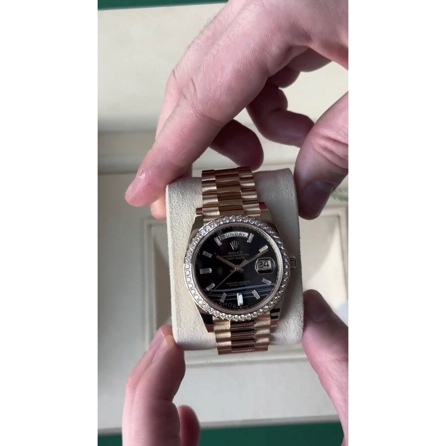 18kt yellow gold case with a 18kt yellow gold president bracelet. Fixed bezel with diamond set. 10 baguette-cut diamonds hour markers. Dial Type: Analog. Date display at the 3 o'clock position. Rolex Calibre 3255 Automatic movement, based upon Rolex 3035, containing 31 Jewels, bitting at 28800 vph, and has a power reserve of approximately 70 hours. Scratch resistant sapphire crystal. Screw down crown. Solid case back. Round case shape, case size: 40 mm. Concealed folding crown clasp. Water resistant at 100 meters / 330 feet. Functions: date, day, hour, minute, second. Day-date 40 Series. Luxury watch style. Watch label: Swiss Made. Rolex Day-Date 40 Onyx Diamond Dial 18kt Yellow Gold Rolex President Men's Watch M228348rbr-0039. CASE Case Size: 40 Case Material: 18kt Yellow Gold Case Shape: Round Case Back: Solid BAND Band Material: 18kt Yellow Gold President Band Type: Bracelet Band Color: Yellow Gold-tone Clasp: Concealed folding Crownclasp DIAL Dial Color: Black Type: Analog Crystal: Scratch Resistant Sapphire Hands: Yellow Gold-tone Dial Markers: 10 baguette-cut diamonds Bezel: Fixed Bezel Color: Yellow Gold-tone Bezel Material: Diamond Set 18kt Yellow Gold Crown: Screw Down INFORMATION Brand: Rolex Series: Day-Date Collection Name: Day-Date 40 Gender: Mens Model: M228348rbr-0039 Watch Label: Swiss Made Movement: Automatic Engine: Rolex Calibre 3255 Power Reserve: 70 hours FEATURES Water Resistance: 100 meters / 330 feet Calendar: Date display at the 3 o'clock position Functions: Date, Day, Hour, Minute, Second Watch Features: Analog, Gold, Diamond ADDITIONAL INFO Watch Style: Luxury Warranty: 2 Year Jomashop Warranty Additional Info: Original Box, Manual (Complete Accessories) Jomashop Sku: RLX228348RBR-0039 Item Variation: 228348rbr-0039 Department: Watches Category: Watches