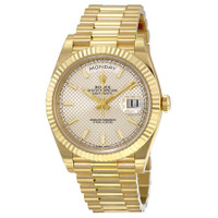 18kt yellow gold case with a 18kt yellow gold Rolex president bracelet. Fixed fluted 18kt yellow gold bezel. Silver diagonal motif dial with luminous yellow gold hands and index hour markers. Minute markers around the outer rim. Dial Type: Analog. Luminescent hands. Date display at the 3 o'clock position. day of the week display at 12 o'clock. Rolex calibre 3255 automatic movement, based upon Rolex 3035, containing 31 Jewels, bitting at 28800 vph, and has a power reserve of approximately 70 hours. Scratch resistant sapphire crystal. Screw down crown. Solid case back. Round case shape. Case size: 40 mm. Concealed crown clasp. Water resistant at 100 meters / 330 feet. Functions: date, day, hour, minute, second, chronometer. Day-date 40 Series. Luxury watch style. Watch label: Swiss Made. Rolex Day-Date 40 Silver Diagonal Motif Dial 18K Yellow Gold President Automatic Men's Watch 228238SSP. CASE Case Size: 40 Case Material: 18kt Yellow Gold Case Shape: Round Case Back: Solid BAND Band Material: 18kt Yellow Gold Rolex President Band Type: Bracelet Band Color: Yellow Gold-tone Clasp: Concealed Crown DIAL Dial Color: Silver Diagonal Motif Type: Analog Crystal: Scratch Resistant Sapphire Hands: Luminous Yellow Gold Dial Markers: Index Second Markers: Minute Markers around the outer rim Luminiscence: Hands Bezel: Fixed Fluted Bezel Material: 18kt Yellow Gold Crown: Screw Down INFORMATION Brand: Rolex Series: Day-Date 40 Collection Name: Day-Date 40 Gender: Mens Model: 228238SSP Watch Label: Swiss Made Movement: Automatic Engine: Rolex Calibre 3255 Power Reserve: 70 hours FEATURES Water Resistance: 100 meters / 330 feet Calendar: Date display at the 3 o'clock position. Day of the Week Display at 12 o'clock. Functions: Date, Day, Hour, Minute, Second, Chronometer Watch Features: Gold, Chronometer, Analog ADDITIONAL INFO Watch Style: Luxury Warranty: 2 Year Jomashop Warranty UPC Code: 845960072052 Jomashop Sku: RLX228238SSP Item Variation: M228238-0008 Department: Watches Category: Watches
