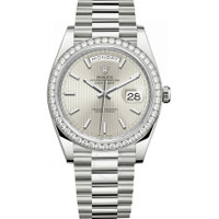 18kt white gold case with a 18kt white gold president bracelet. Fixed- diamond set bezel. Silver stripe dial with silver-tone hands and index hour markers. Dial Type: Analog. Date display at the 3 o'clock position. Rolex Calibre 3255 Automatic movement, based upon Rolex 3035, containing 31 Jewels, bitting at 28800 vph, and has a power reserve of approximately 70 hours. Scratch resistant sapphire crystal. Screw down crown. Solid case back. Round case shape, case size: 40 mm. Folding clasp. Water resistant at 100 meters / 330 feet. Functions: date, day, hour, minute, second. Day Date 40 Series. Luxury watch style. Watch label: Swiss Made. Rolex Day Date 40 Silver Stripe Dial Automatic Men's 18kt White Gold Watch 228349SSP. CASE Case Size: 40 Case Material: 18kt White Gold Case Shape: Round Case Back: Solid BAND Band Material: 18kt White Gold President Band Type: Bracelet Clasp: Folding DIAL Dial Color: Silver Stripe Type: Analog Crystal: Scratch Resistant Sapphire Hands: Silver-tone Dial Markers: Index Bezel: Fixed- Diamond Set Crown: Screw Down INFORMATION Brand: Rolex Series: Day-Date Collection Name: Day-Date Gender: Mens Model: 228349SSP Watch Label: Swiss Made Movement: Automatic Engine: Rolex Calibre 3255 Power Reserve: 70 hours FEATURES Water Resistance: 100 meters / 330 feet Calendar: Date display at the 3 o'clock position Functions: Date, Day, Hour, Minute, Second Watch Features: Diamond, Gold, Analog ADDITIONAL INFO Watch Style: Luxury Warranty: 2 Year Jomashop Warranty Jomashop Sku: RLX228349SSP Department: Watches Category: Watches