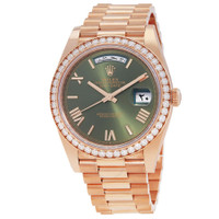 18kt everose gold case with a 18kt everose gold rolex president bracelet. Fixed bezel with diamond set 18kt everose gold. Green dial with rose gold-tone hands and Roman numeral-index hour markers. Dial Type: Analog. Date display at the 3 o'clock position. Rolex Calibre 3255 Automatic movement, based upon Rolex 3035, containing 31 Jewels, bitting at 28800 vph, and has a power reserve of approximately 70 hours. Scratch resistant sapphire crystal. Screw down crown. Solid case back. Round case shape, case size: 40 mm. Crown clasp. Water resistant at 100 meters / 330 feet. Functions: date, day, hour, minute, second. Day-date 40 Series. Luxury watch style. Watch label: Swiss Made. Item Variations: 228345RBR-0022. Rolex Day-Date 40 Automatic Diamond Green Dial Men's Watch M228345RBR-0022. CASE Case Size: 40 Case Material: 18kt Everose Gold Case Shape: Round Case Back: Solid BAND Band Material: 18kt Everose Gold Rolex President Band Type: Bracelet Band Color: Rose Gold-tone Clasp: Crownclasp DIAL Dial Color: Green Type: Analog Crystal: Scratch Resistant Sapphire Hands: Rose Gold-tone Dial Markers: Roman Numeral-Index Bezel: Fixed Bezel Color: Rose Gold-tone Bezel Material: Diamond Set 18kt Everose Gold Crown: Screw Down INFORMATION Brand: Rolex Series: Day-Date Collection Name: Day-Date 40 Gender: Mens Model: M228345RBR-0022 Watch Label: Swiss Made Movement: Automatic Engine: Rolex Calibre 3255 Power Reserve: 70 hours FEATURES Water Resistance: 100 meters / 330 feet Calendar: Date display at the 3 o'clock position Functions: Date, Day, Hour, Minute, Second Watch Features: Diamond, Gold, Analog ADDITIONAL INFO Watch Style: Luxury Warranty: 2 Year Jomashop Warranty Jomashop Sku: RLX228345RBR-0022 Item Variation: 228345RBR-0022 Department: Watches